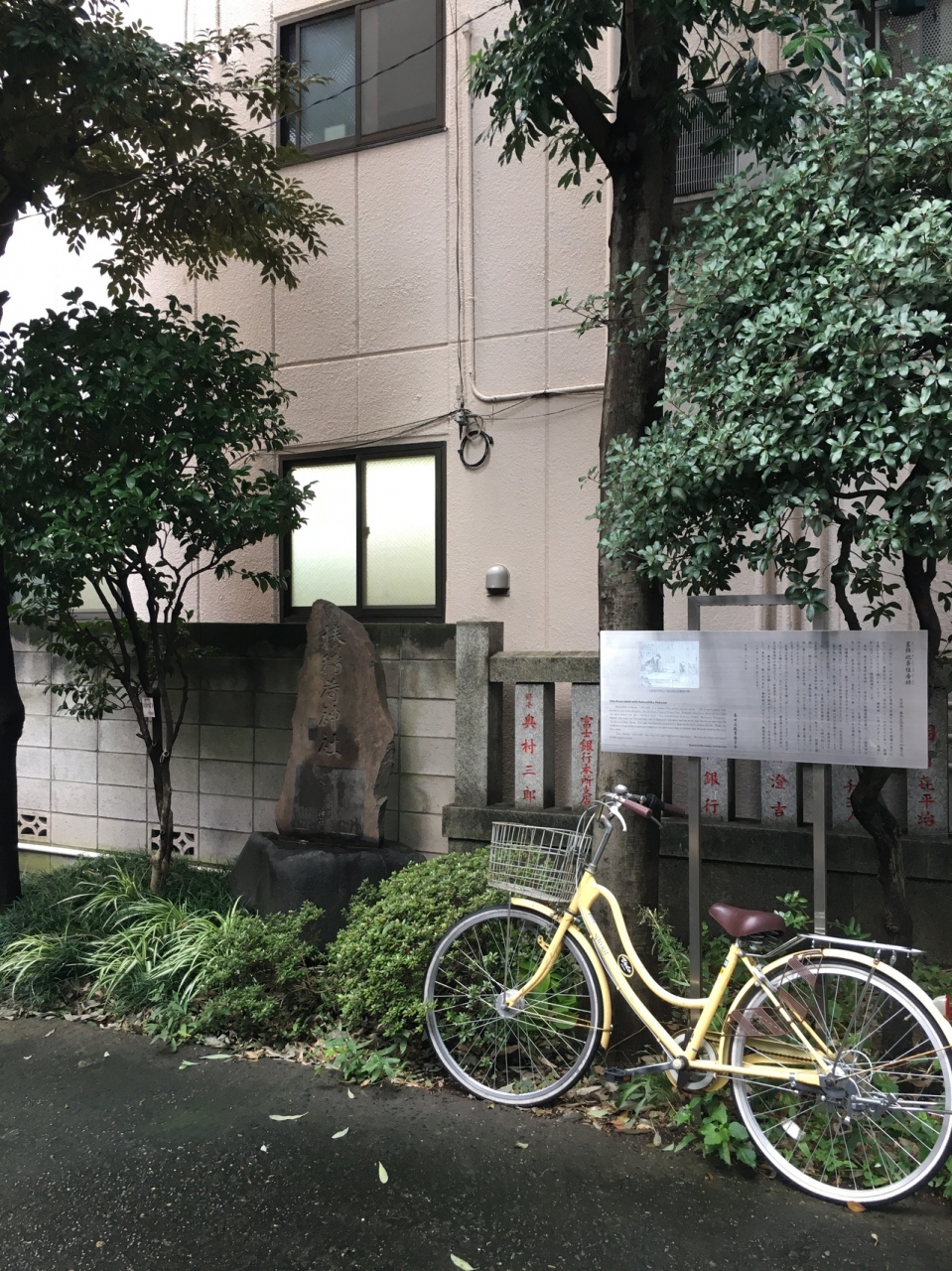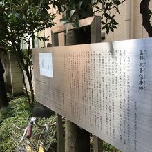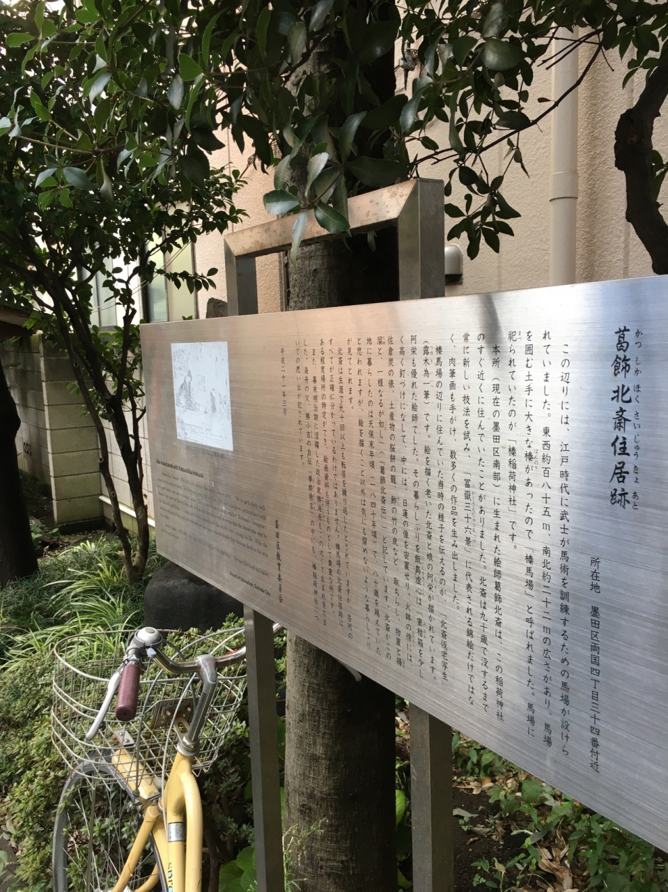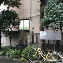 ビルで、囲まれた稲荷神社ので境内にありました。説明の看板があり、詳しく生い立ちの記載がありました。看板には葛飾北斎が書いた絵も掲示されていています。住居の跡とは思えない感じの場所で、ひっそりしていました。