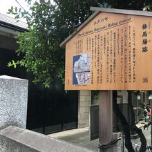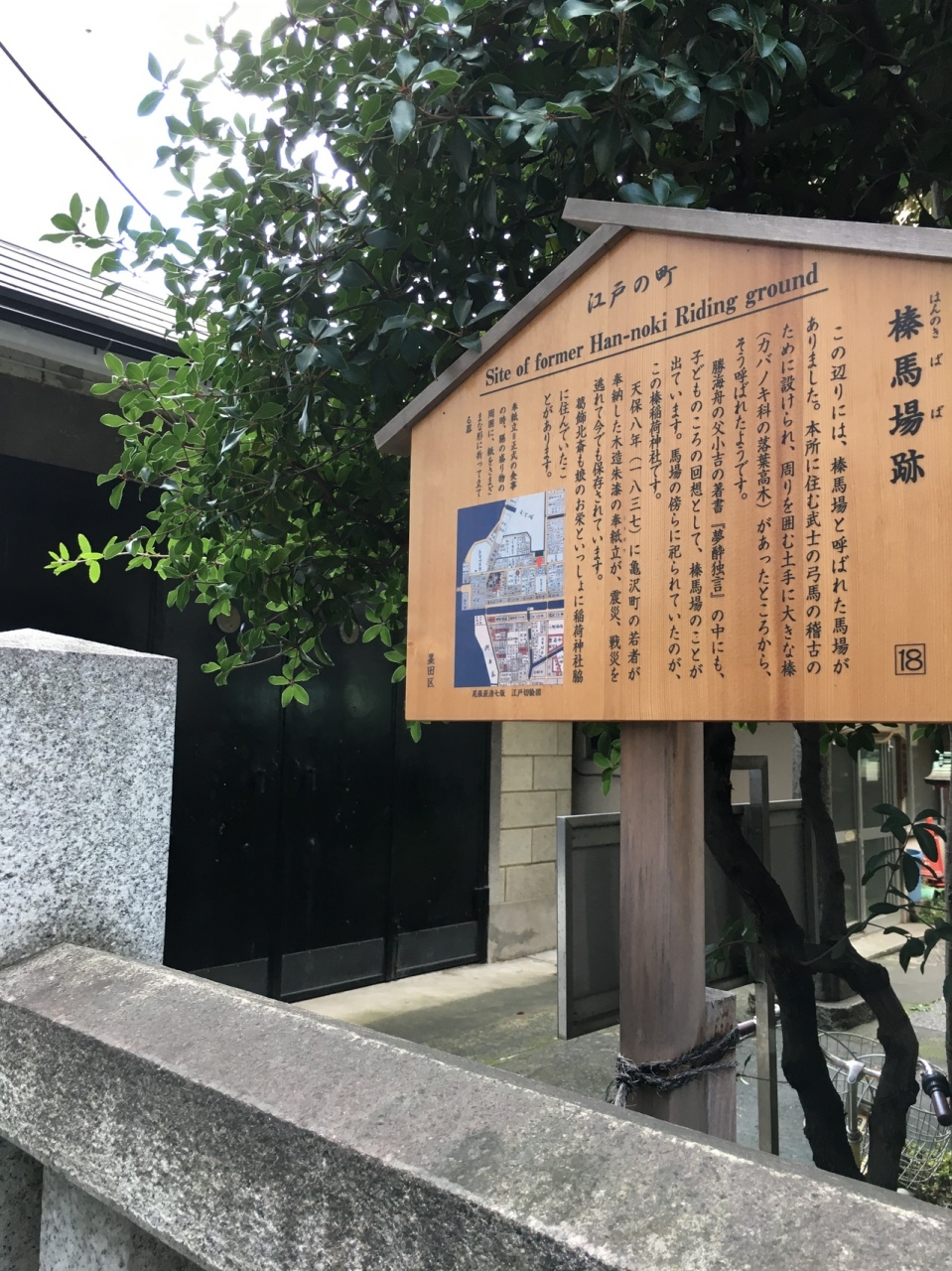江戸時代の武士の弓場の稽古場ですが、現在はビルに囲まれた神社内に、説明の看板があるのみです。当時の面影は全く感じられない場所でした。看板には江戸時代の屋敷の地図が掲載されていました。看板の後方には大きな木があります。