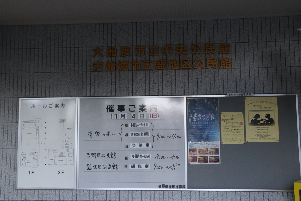 南リアス線の盛駅前にある2階建ての立派な建物です。中は多目的室や会議室などがあり公民館の役割を果たしているようでした。祭事なども行われるようで行事予定も張られていました。特に観光的なコンテンツがあるわけではなく、地域住民の憩いの場になっている様子です。