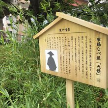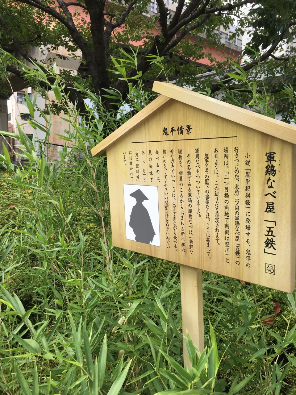 二之橋と言う橋の手前に草が茂っている場所がり、木で出来た説明の看板が現在はあるのみです。草の後ろには木が生えていました。江戸時代の小説に登場する鬼平という人が良く行く行きつけの店の跡らしく、小説の場所が跡としての説明の看板があるとは驚きでした。看板には鬼平の姿でしょうか。絵で武士の姿の絵が描かれていました。