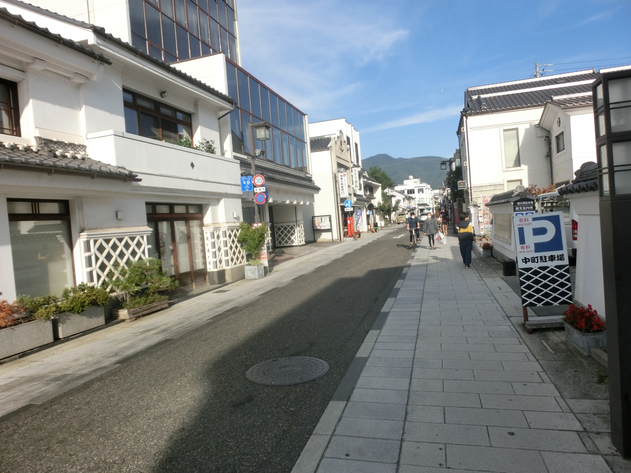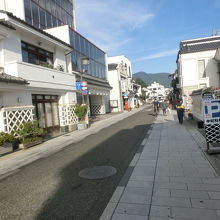 両側は白壁、なまこ壁の土蔵風の建物が続く、白と屋根の黒とのコントラストが美しい。