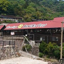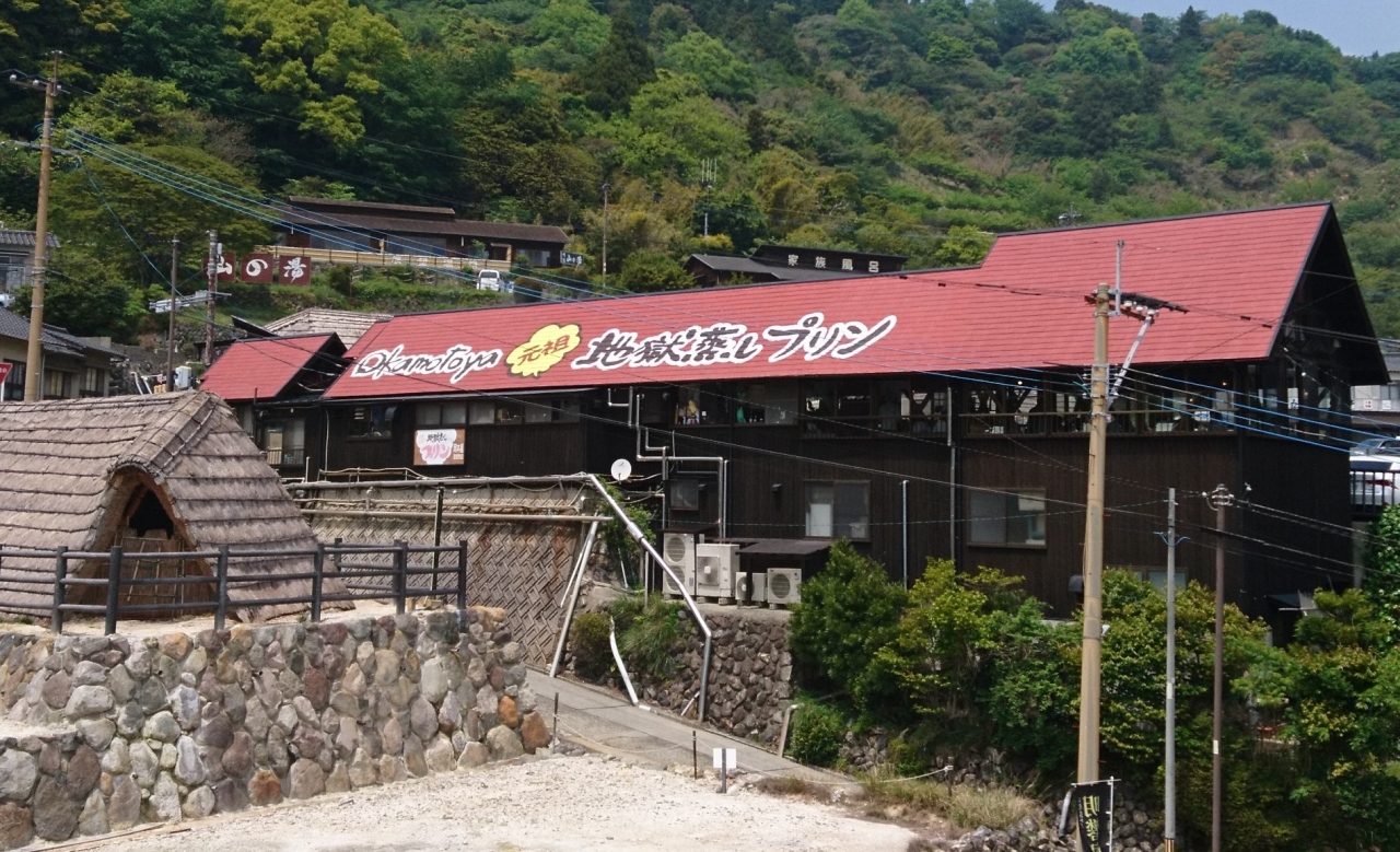 元祖地獄蒸しプリンのお店で屋根に大きく書いてあるので目立ちます。プリンの他にもうどんやカレーなど食事をすることも出来ます。お昼時に立ち寄ったのですが休日だったこともあり駐車待ちの車で大混雑でした。食事もプリンも美味しかったので混むのも納得です。