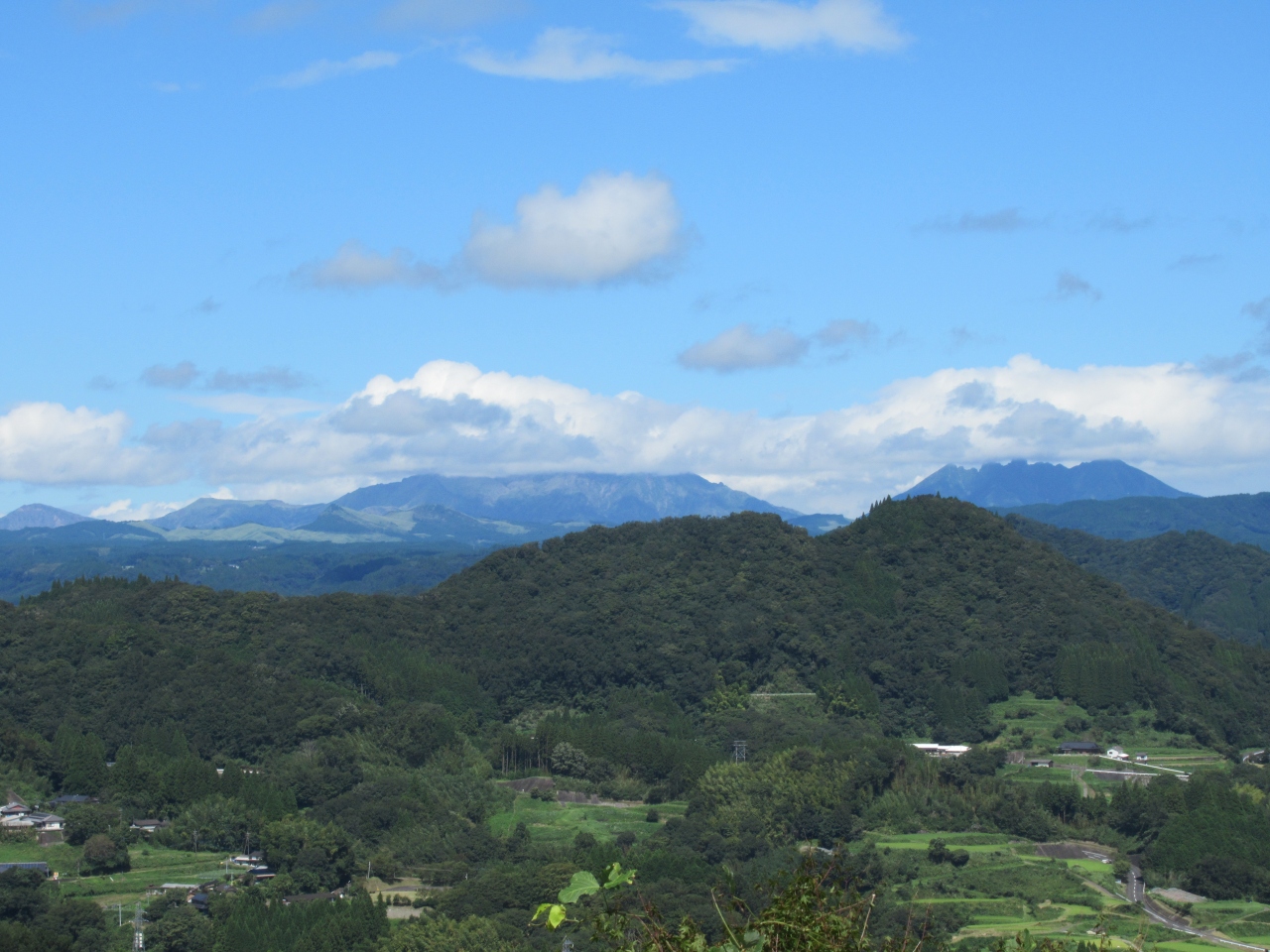 車でクネクネとした坂を上がっていくと広い駐車場がありました。そこから歩いて展望台に行くと、阿蘇の五岳や祖母連山など、大パノラマが楽しめます。神武天皇の御孫・建磐龍命(タテイワタツノミコト)が、 九州統治の際に立ち寄って国見をされたという伝説の丘が国見ヶ丘です。民謡「正調刈干切唄」の発祥地でもあります。