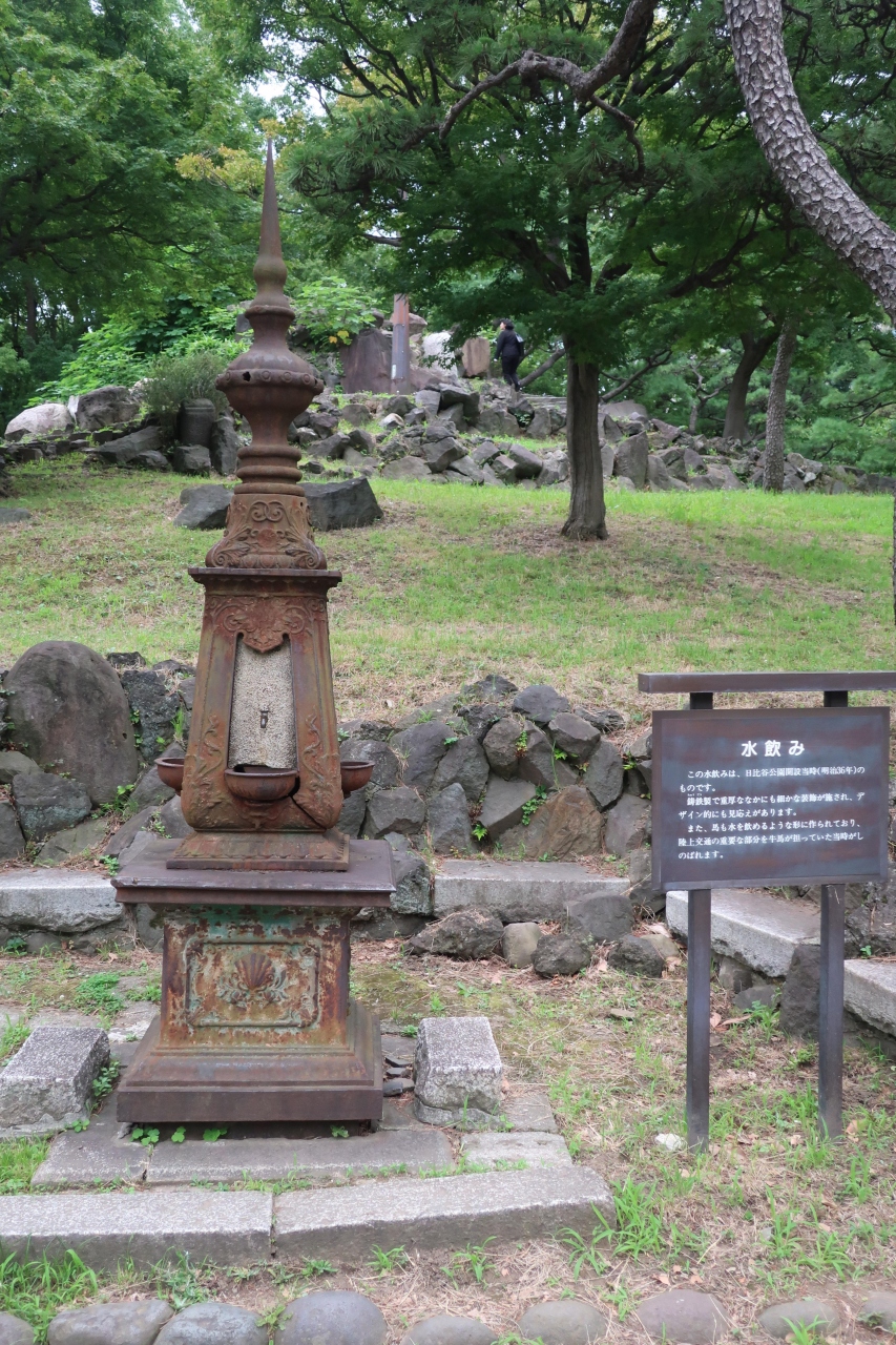 日比谷公園の松本楼と雲形池のほぼ中間地点と、三笠山の麓に馬の水飲み場跡があります。色は違いますがどちらも同じデザイン。日比谷公園開園時の明治36年製で当時は未だ馬が交通手段として使われており、水飲み場があった様です。なかなか洒落たデザインですが、日比谷公園の中を馬がかっ歩していたのかと思うと面白くなります。