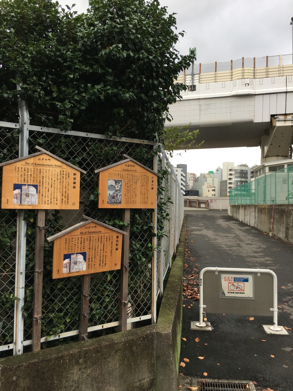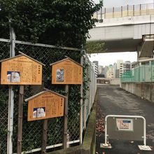 3つある看板の右にありました。大通りから行くと少し、斜めになった金網にあるので見逃してしまいそうな場所にあります。近くの橋の入り江に生える葦は同じ方向に生えたので江戸時代この名前がついたようです。周辺には葦もなく、道路でした。看板には絵が描かれて、歌舞伎役者の人のような絵柄でした。