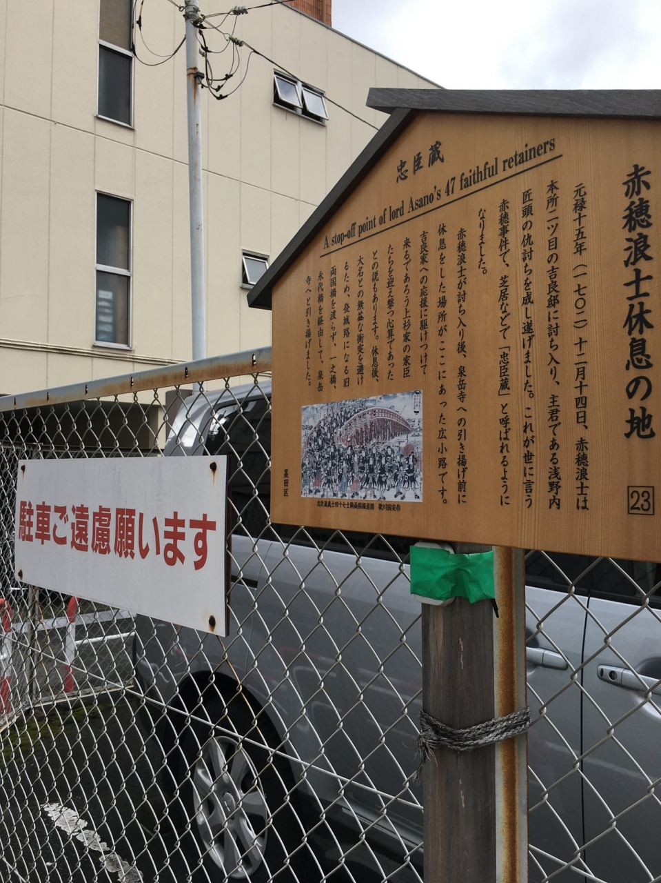 赤穂浪士が吉良邸で、浅野内匠頭の仇を成し遂げ、引き揚げの際に休んだ場所です。現在は小さな駐車場になっていました。説明看板の絵には両国撤退図の絵が描かれ、勇ましい雰囲気を醸し出していました。殺風景な場所でしたが絵柄が良かったです。