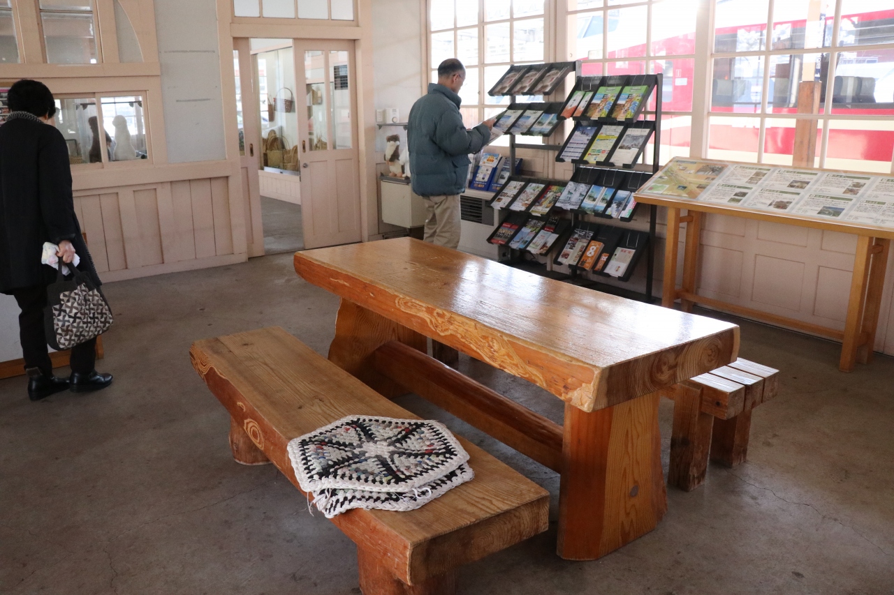 椅子やテーブル・観光パンフレットなどが置いてありますが暖房は無く冬季は非常に寒いです。隣の日帰り温泉や湯田中駅舎とは離れているので、特に用もないし立ち寄ることもあまりないのではないかと・・・ 事前申請&有料ですが、展示スペースとしての利用もできるようです。