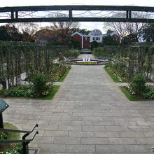 係の人がちょうど手入れをされていました。冬とはいえ、パンジーなどそれなりに花も咲いてきれいでしたよ。もっとも、薔薇が咲いたらさぞかしもっときれいでしょうね。「沈床花壇」は文字通り地面を掘り下げるのでしょうが、どういうメリットがあるのでしょうか園芸は全く詳しくないので、よくわかりません。