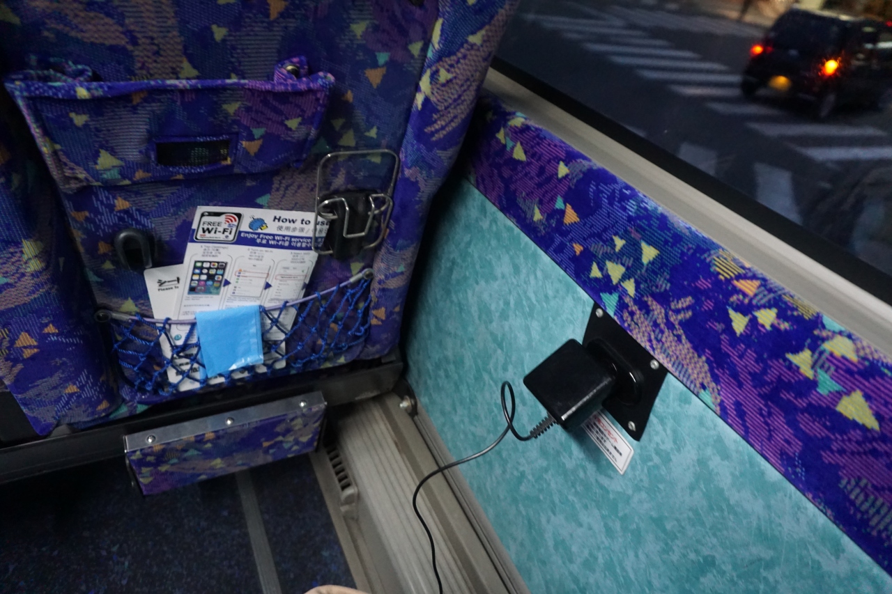 席の横にコンセントが付いていて、充電が可能。最近の高速バスは進化しているのかな。けっこうありがたく感じました。