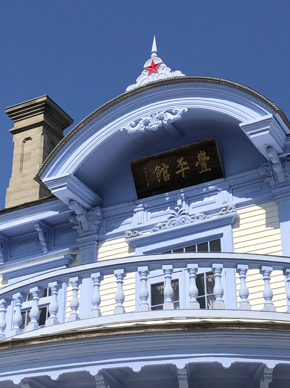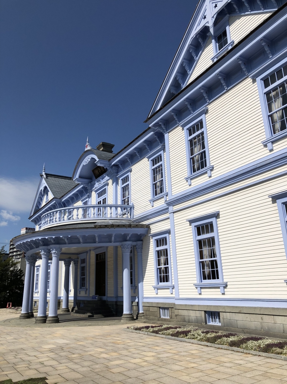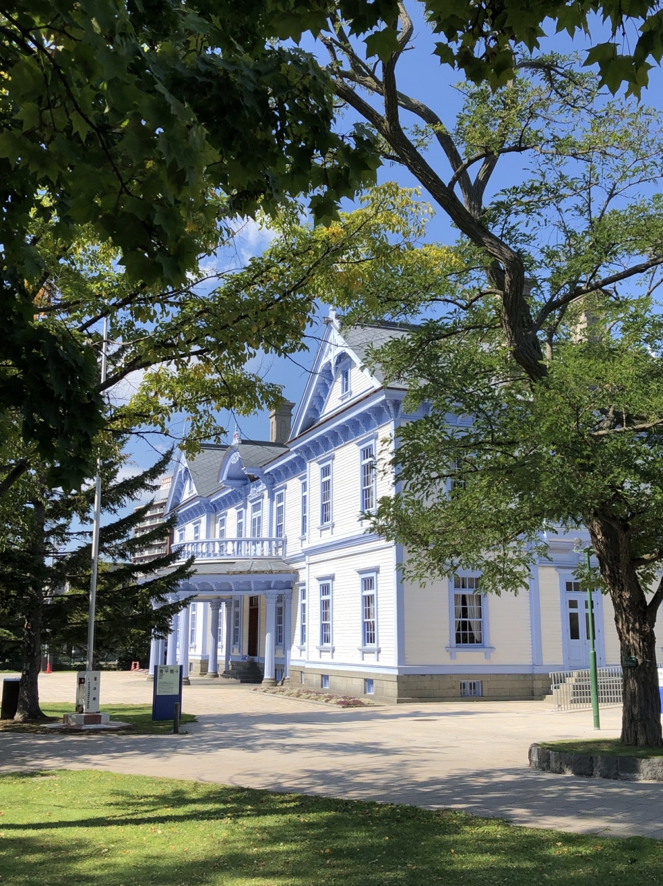 現在は札幌市内の中島公園に移築されている…北側の入り口から入って公園内を道なりに歩いて、日本庭園入口を過ぎると、豊平館の外壁の鮮やかな水色が目に入る