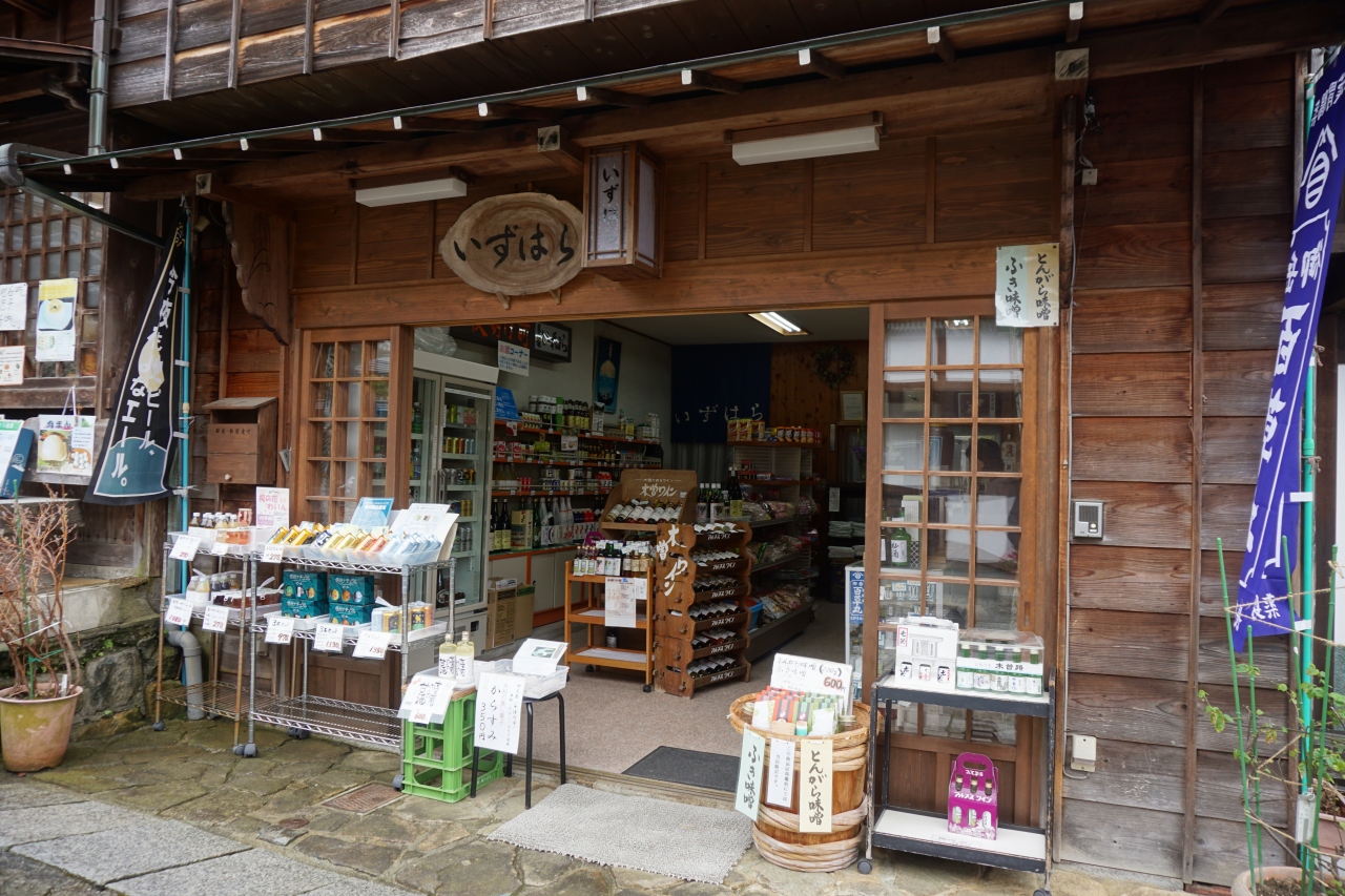 いずはらは、馬籠宿の小さな酒屋さん。馬籠にはさすがに酒蔵はないので、あちこちから取り寄せた品ぞろえです。島崎藤村に関係する銘柄酒「夜明け前」を置いていましたが、上伊那の酒造メーカーのものだそうです。その他、木曽ワインも気になりました。