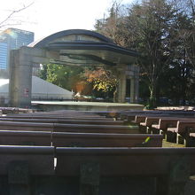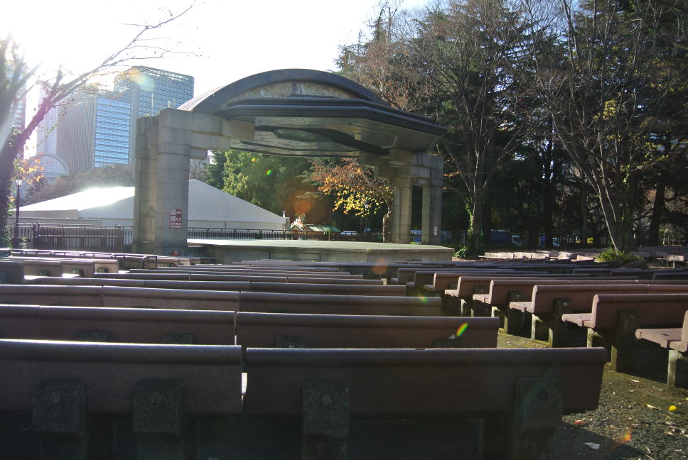 野外音楽堂です。大阪や京都、名古屋などでも大きな公園には必ず野外音楽堂がありますね。西洋の公園の様式をそのまま取り入れたのでしょう。小音楽堂というだけあって、座席数はそれほど多くはありませんが、とても雰囲気のよい音楽堂です。ただ、周囲の石積みが崩れかけたりして少々老朽化している印象。