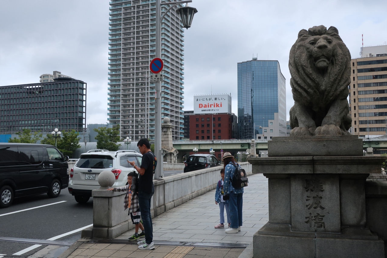 中之島の東部、北浜と西天満を結ぶ橋が難波橋です。大正4年に架けられた橋は美しいアーチの橋です。そして、一番の特徴は橋の南北橋詰の親柱に置かれたライオン像。よく見ると仁王像のごとく片方は口を開き、反対側は閉じ、仁王像の様に阿吽をなしています。和の意をもつ西洋像が面白い。