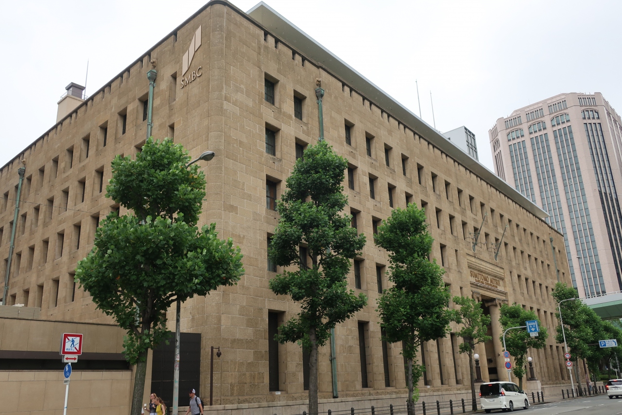大阪の北浜、淀屋橋界隈には戦前から残る近代洋風建築(所謂レトロ建築)が多く残る場所で、三井住友銀行大阪本店もその一つです。大正15年に住友ビルディングとして建てられた建物は分厚い石組みの直線的な外観に巨大なファサードの入口が、いかにも銀行と言った雰囲気を醸し出しています。東京日本橋の三井本館のに勝るとも劣らないレトロ建築です。