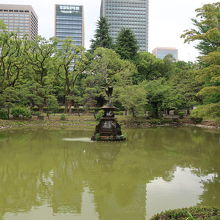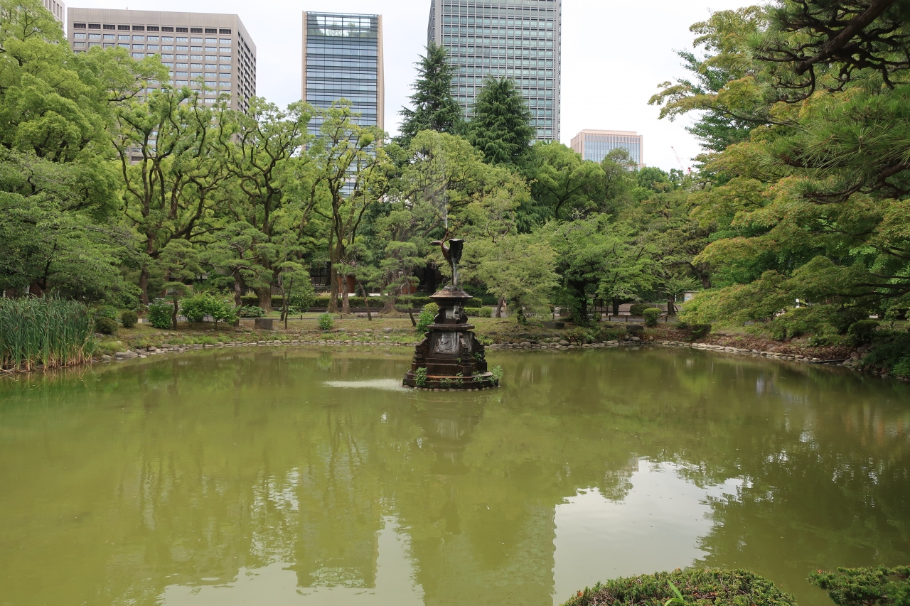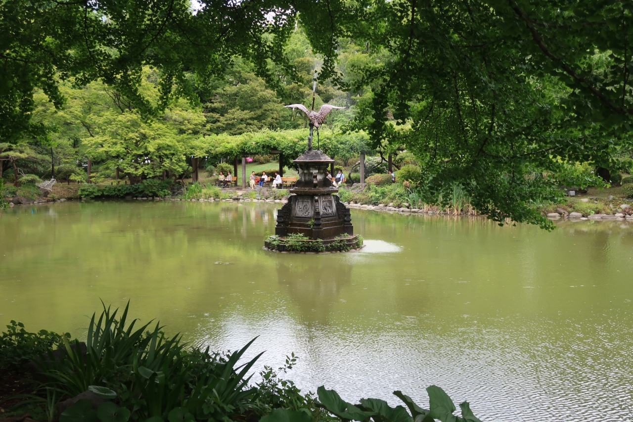 日比谷公園には大きな池が二つありますが、西部、大音楽堂の北にある池が雲形池です。心字池とは雰囲気が異なり、大きな木々に囲まれ、池の中央部には鶴の噴水が設置されています。また、池の周りは散策路があり、東屋や藤棚もあり、池を眺めてのんびりとした気分になれる場所で、私は第一花壇と並んで好きな場所です。