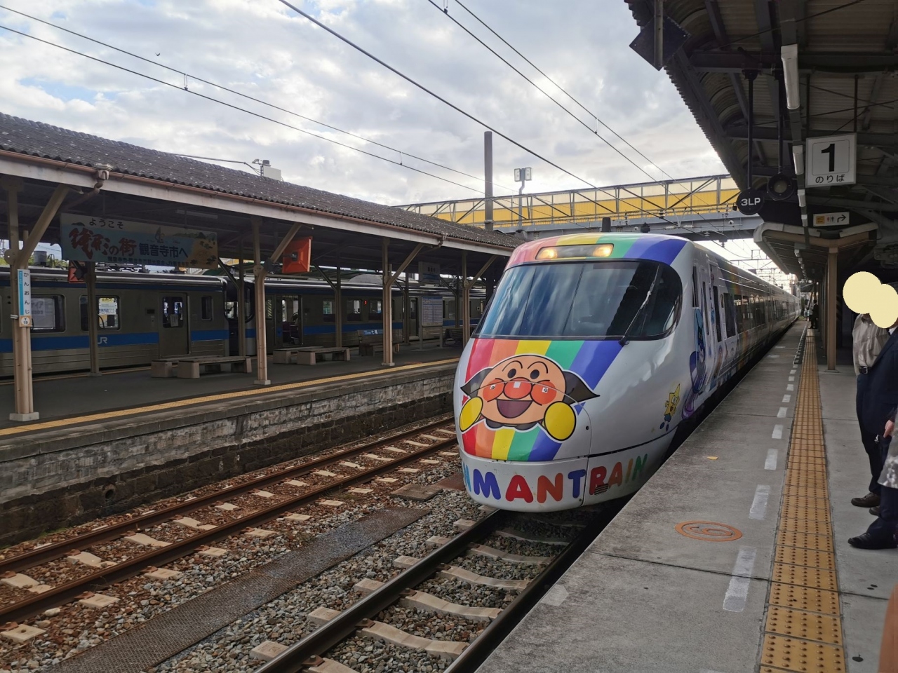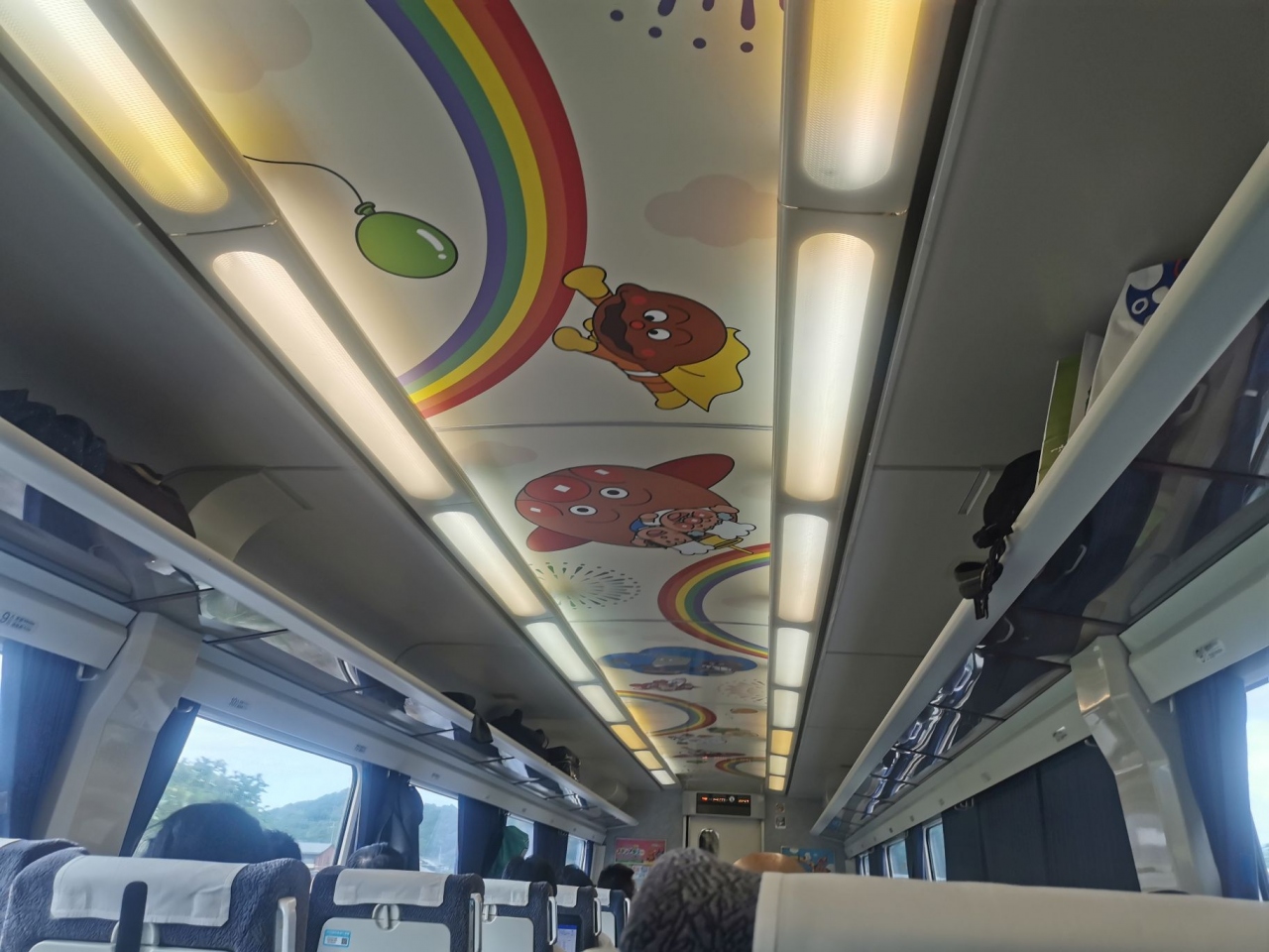 今回は、アンパンマン号と言う事で、車両の外も中もアンパンのキャラクターがあしらわれており、駅に到着する際に音楽やアナウンスもアンパンマンを利用したものでした。