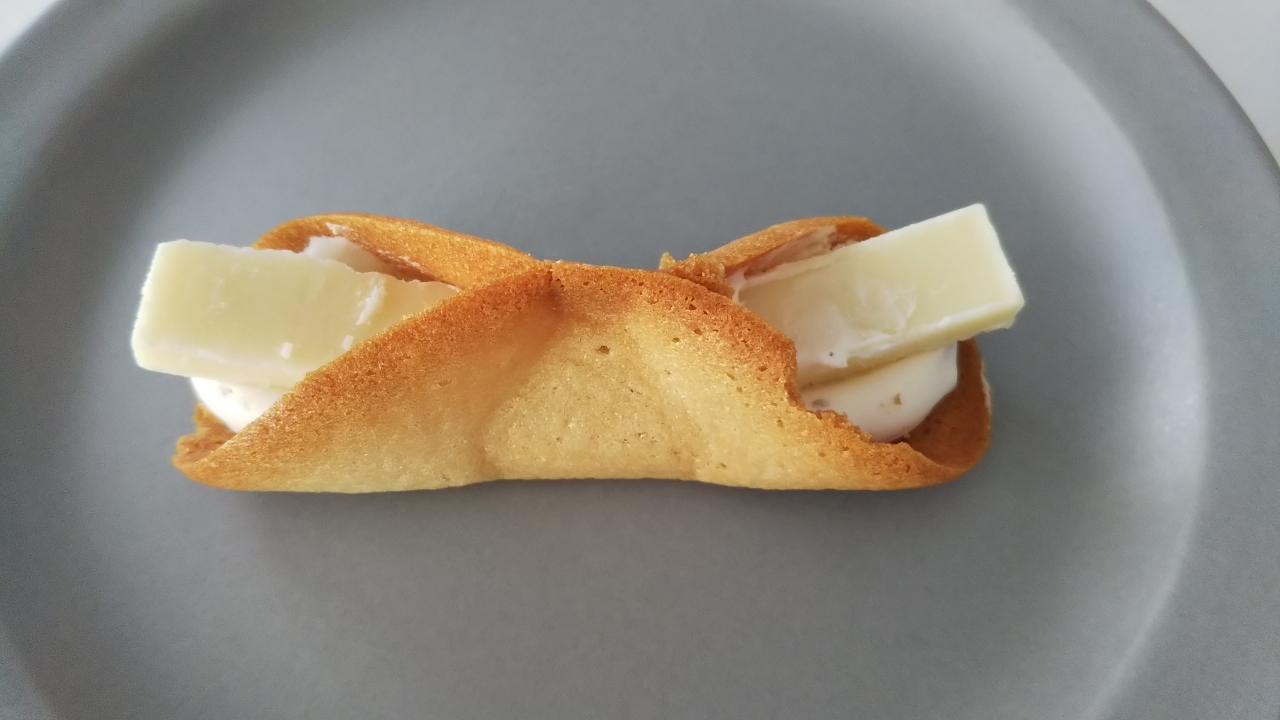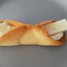 個包装の袋を開けると、チーズの濃厚な香り漂います。スイーツというより、ワインなどお酒のあてになりそうな感じです。薄くて今にも割れないか心配になりそうな、繊細なクッキー。その中に、クリームとチーズチョコレートが挟まれています。それぞれにチーズの風味をしっかり持って、そこまで甘さを強調していません。