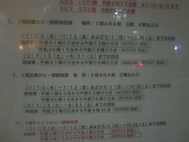 今回は、2019年時点では夏季限定で運航されているNH(全日本空輸)の深夜便を利用してみました。出発時刻が3時半頃と、ターミナルの開館状況が気になりましたが、やはり、深夜の浅い時間帯は、ちょっとだけクローズする時間帯があるようで、深夜便搭乗の場合も、午前1時からのオープンとなっていました。