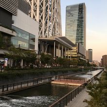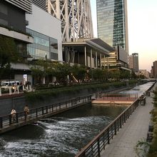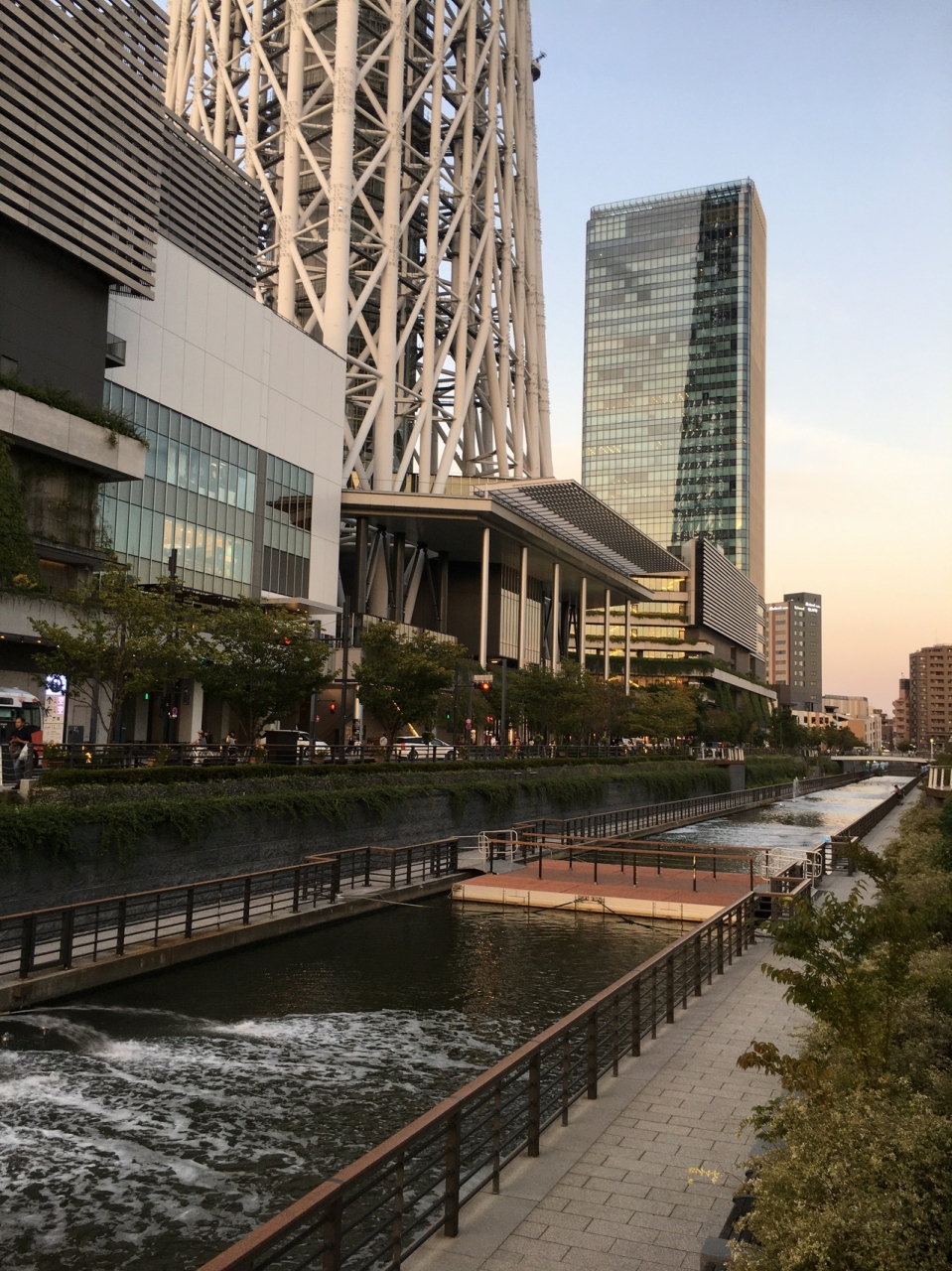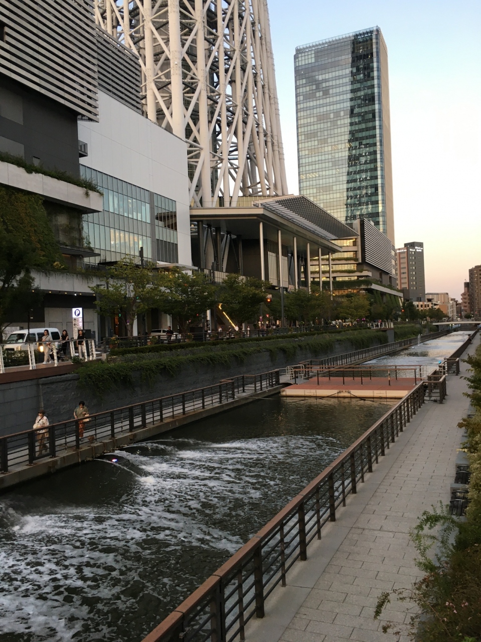 小さな川沿いの遊歩道にある公園で、川沿いに沿った公園です。道より低い位置にあり、川より少し高い場所にあります。川の左右に遊歩道があり途中にいくつかの橋がありました。上を見上げると物凄く高く見える東京スカイツリーがありました。