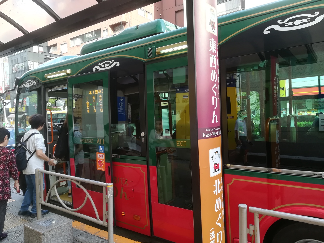 赤と緑の台東区をグルっと巡る、めぐりんバスです。上野から浅草、そして荒川区と隣接した場所まで走っています。片道100円で