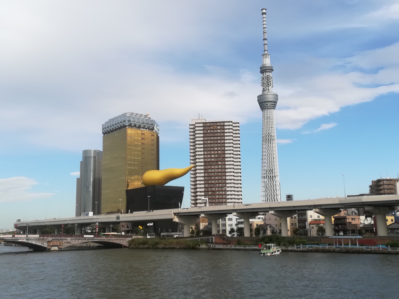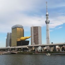 下の隅田川テラスからも、スカイツリーと金色オブジェも綺麗に見えますのでお勧めです。