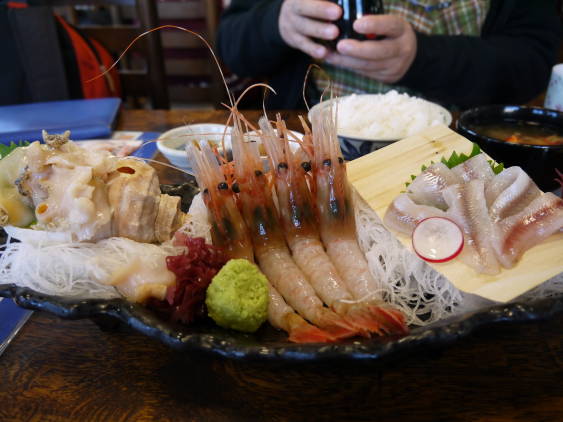 そこで、翌朝、再びクラウンプラザホテルに迎えに来てもらって挑戦しましてみました。気さくな運ちゃんに推薦されたししゃも刺980円、つぶ刺850円、ボタンエビ刺1980円にご飯セット200円と食べログのクーポンでカニ汁をつけてもらい一人2000円ちょっとでした。ししゃもは脂がのっていて、つぶはこりこり、ボタンエビも最高の味で刺身をフルに堪能できました。