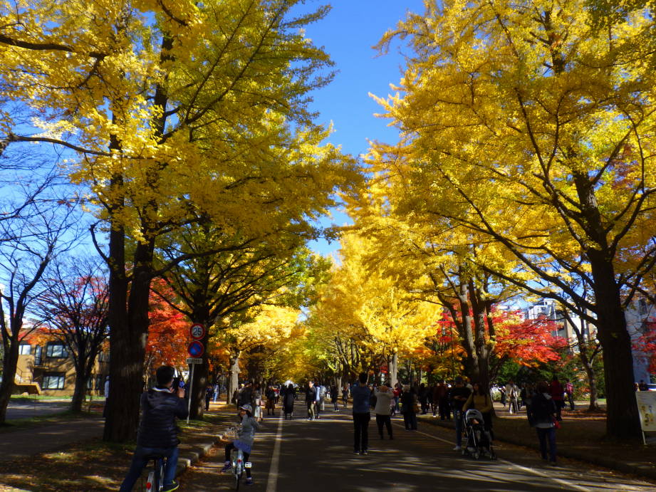 北海道大学の構内に入り、博物館のちょっと越えるとイチョウ並木がありました。11月3日はよく晴れた日でしたので、ちょうどイチョウが紅葉していてとても綺麗でした。一番綺麗な時期に来ることができてラッキーでした。