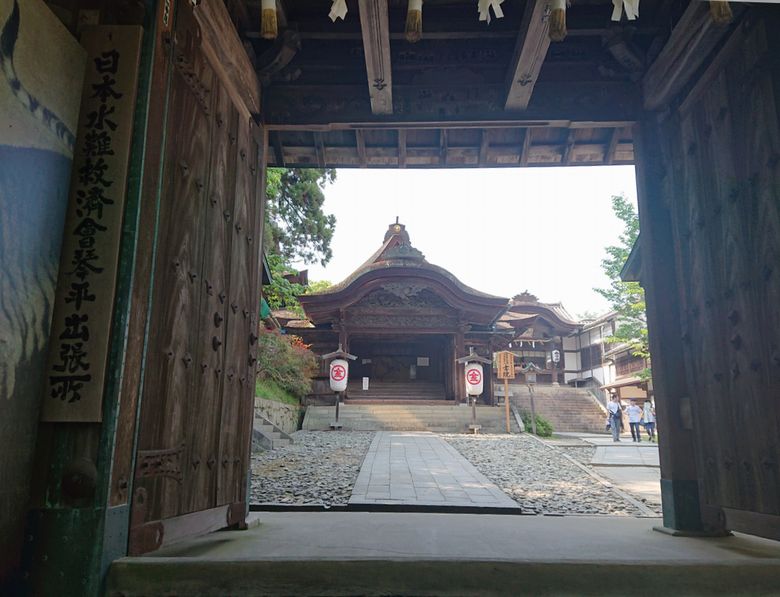 金刀比羅宮の桜馬場西詰銅鳥居をくぐり石段を上っていくと、重厚で立派な社務所門がありました。社務所門脇には虎が描かれた襖絵があり、こんなところにとちょと不思議な感じでした。門をくぐった先には書院がありました。
