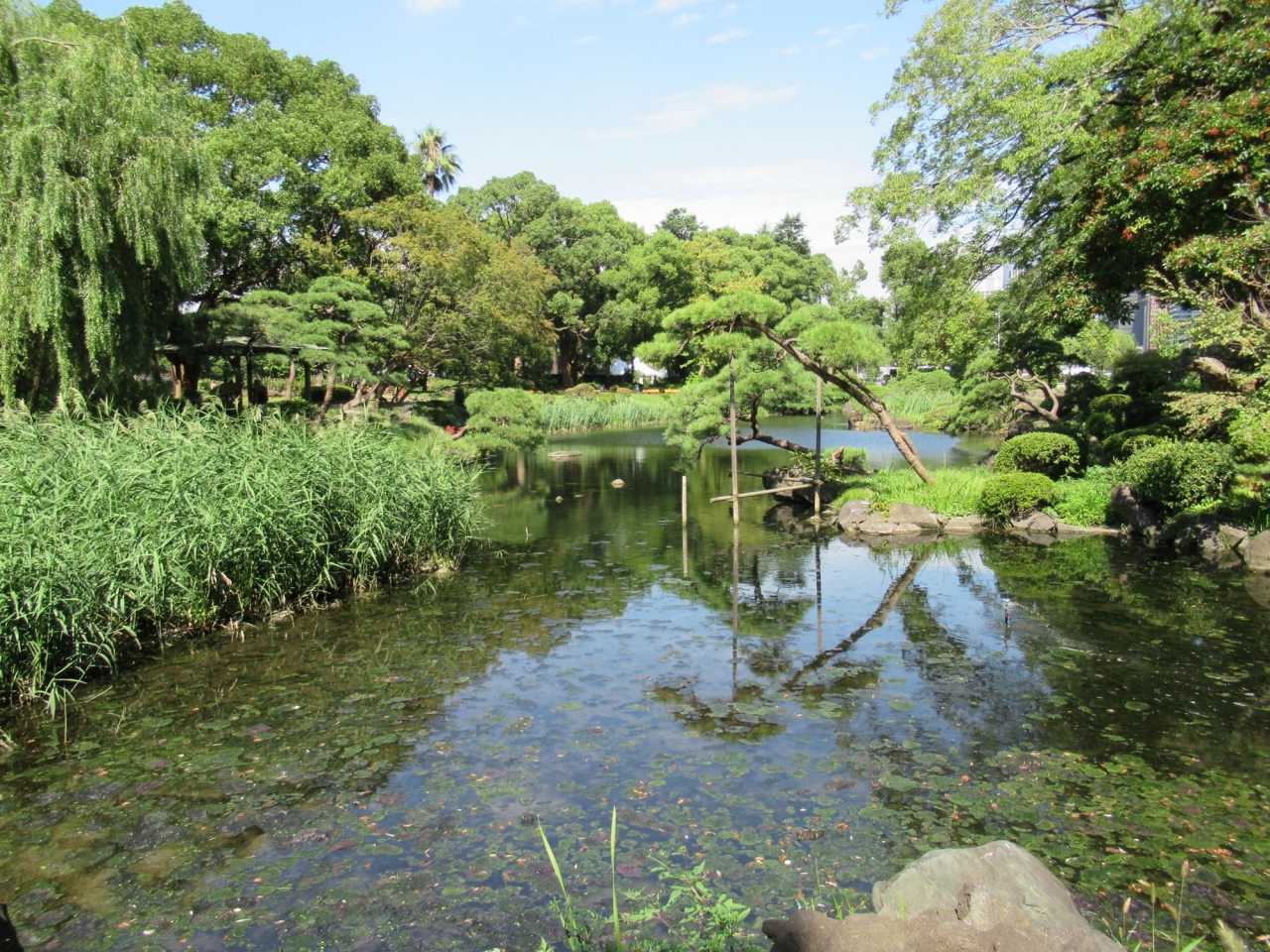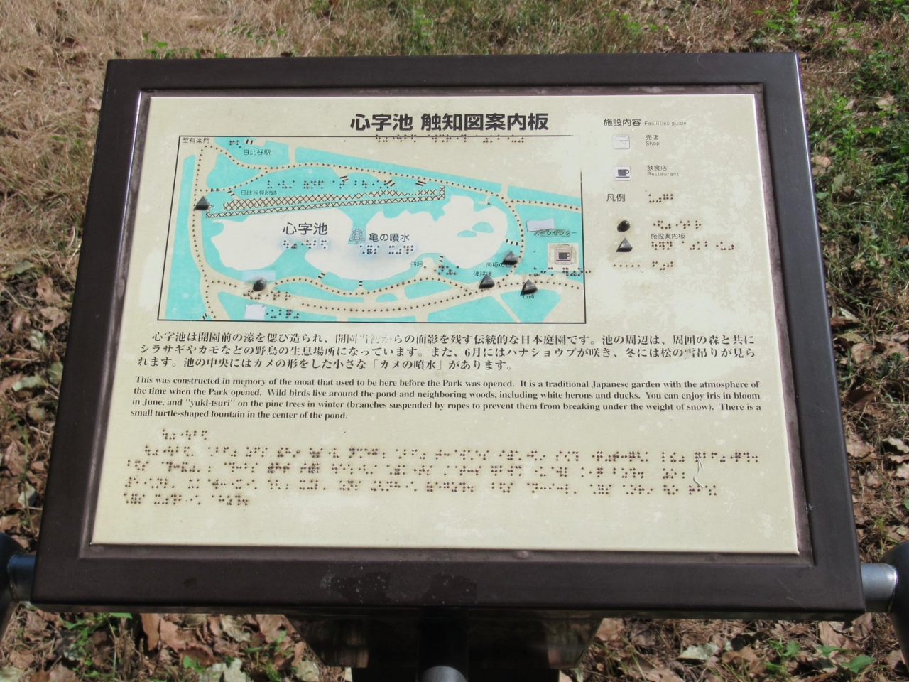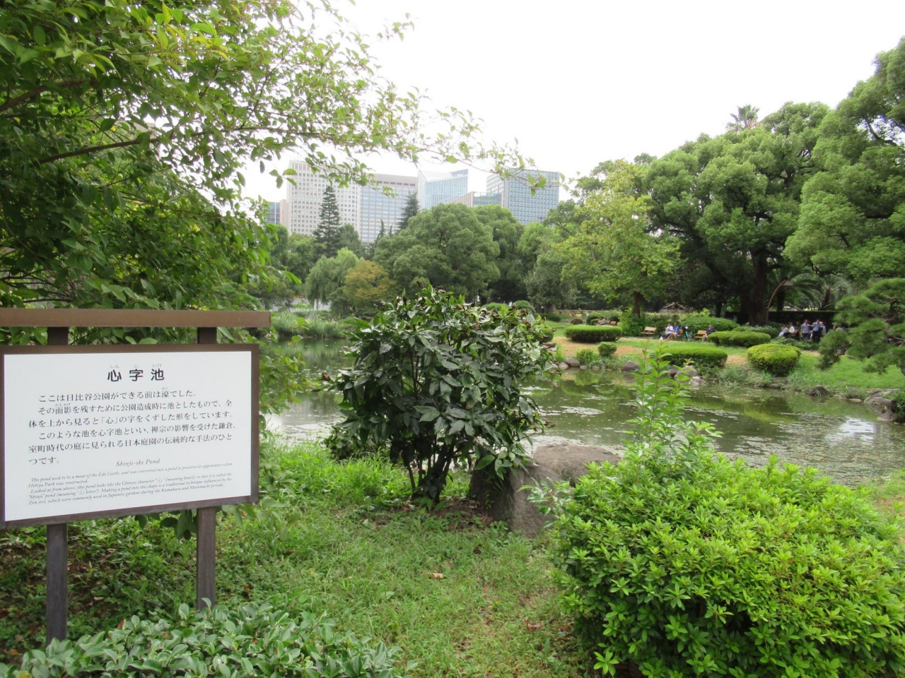 明治36年 (1903) に開園した日本で初めての近代的西洋式の日比谷公園が、以前は濠だったところの面影を残すため公園造成時に池にした伝統的な日本庭園で、全体を上から見ると「心」の字をくずした形をしている。
