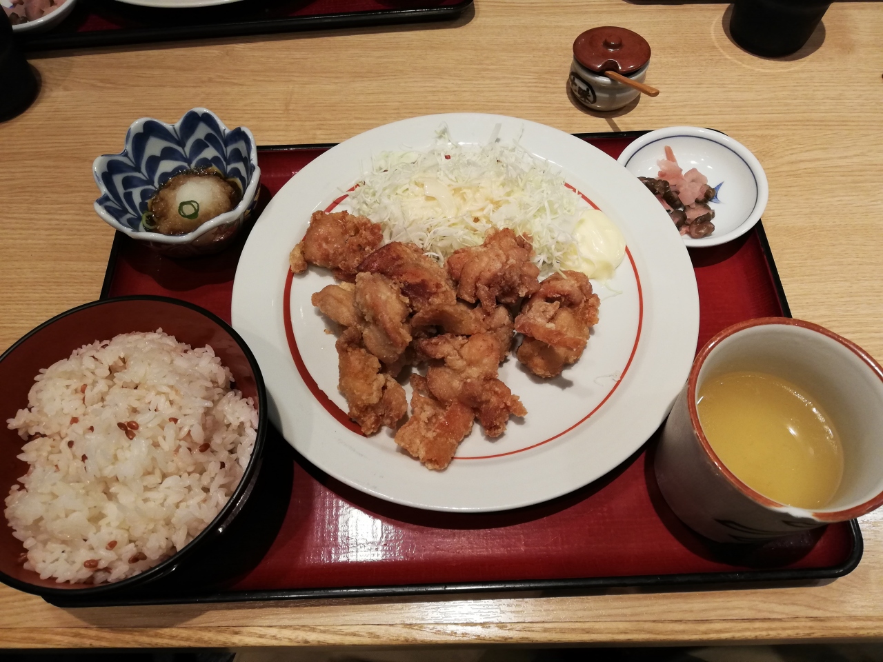 平日のランチで利用しました。12時過ぎの入店でギリギリ席が空いていた状況でした。今回も、「からあげ食べ放題定食」900円を注文しました。料理の提供までは、5分程でしたね。ご飯の量は注文する際に言う必要がありますので、注意してください。