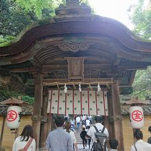 金刀比羅宮の石段642段目にある門です。旭社を右手方面に進み黄銅鳥居をくぐると賢木門があります。柱の一本が逆さにつけられていたので昔は「逆木門」だったそうですが、逆の字を嫌い「賢木門(さかきもん)」となったそうです。大きくはありませんが、重厚さを感じさせる門でした。