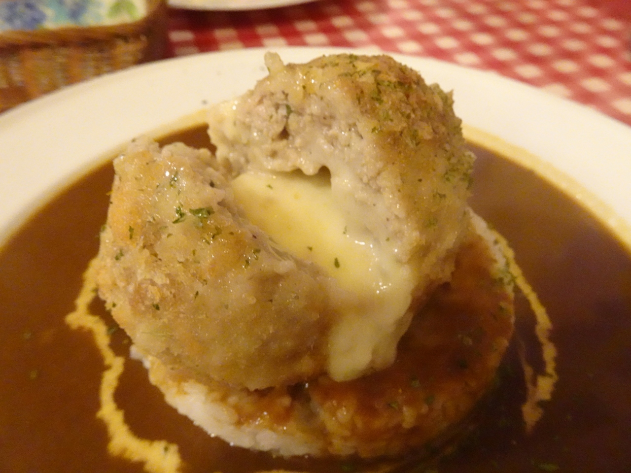 こちらで代表的な料理は「アランドロンカレー」。カレー中央のライス上に球体のハンバーグが鎮座したメニューです。ハンバーグを切ると中からとろりとチーズが流れ出る仕掛けでいわゆるインスタ映えが楽しめます。もちろん見かけだけではなく味にも満足。