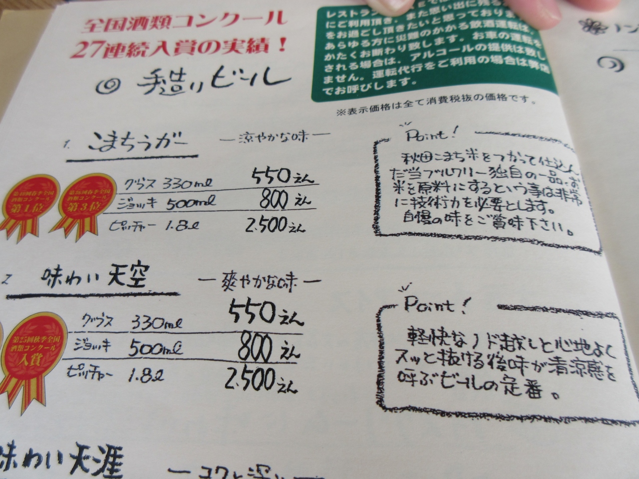 田沢湖畔にある地ビールレストラン。メニューも地元食材をつかったものが多かったです。土曜のランチにおじゃましましした。混んでいるわけでもなく、空いているわけでもありませんでした。ここでつくっているという地ビールを楽しみました。どうせなら工場の見学できればよいのに、それはしていないとのことでした。