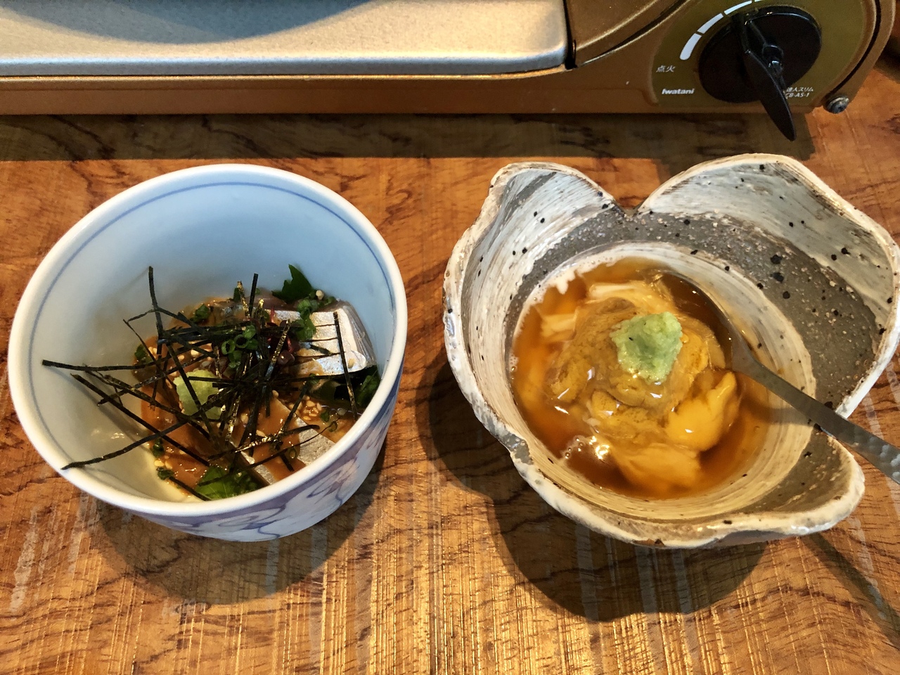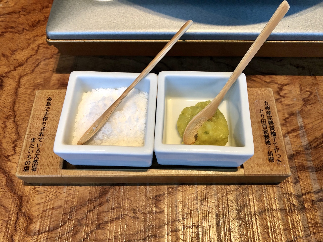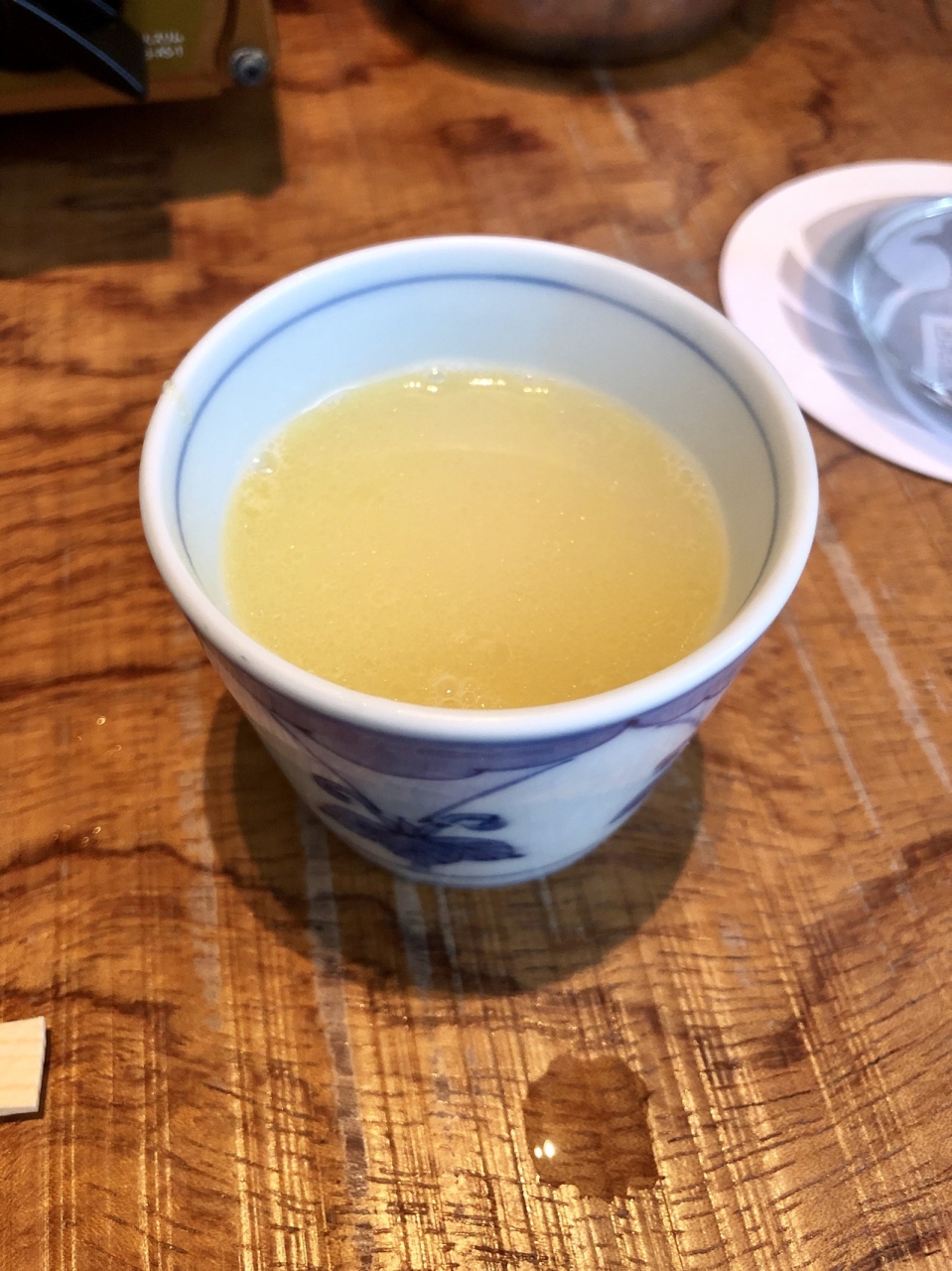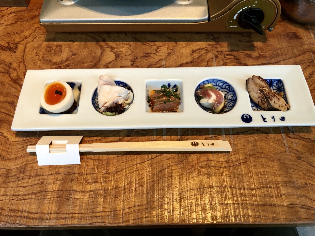 ほどなくして黄金色のスープがやってきて火を入れます。有田焼の器には前菜5種が運ばれ、たまご、とりわさ、自家製明太子、季節の前菜、鶏の炙り焼きどれも美味しい。そのあとのごま鯖はしっかりした味、雲丹と生湯葉は優しい味。前菜を食べていい頃合いで熱熱の黄金色のスープをいただくと自然と笑みがこぼれる美味しさ。スープの中にいる鶏は柔らかくて美味しいです。お店の方が軟骨やレバーなどが入ったミンチボールと野菜を入れていただきます。
