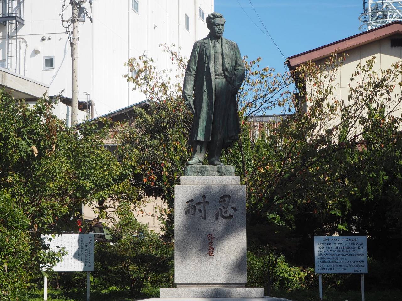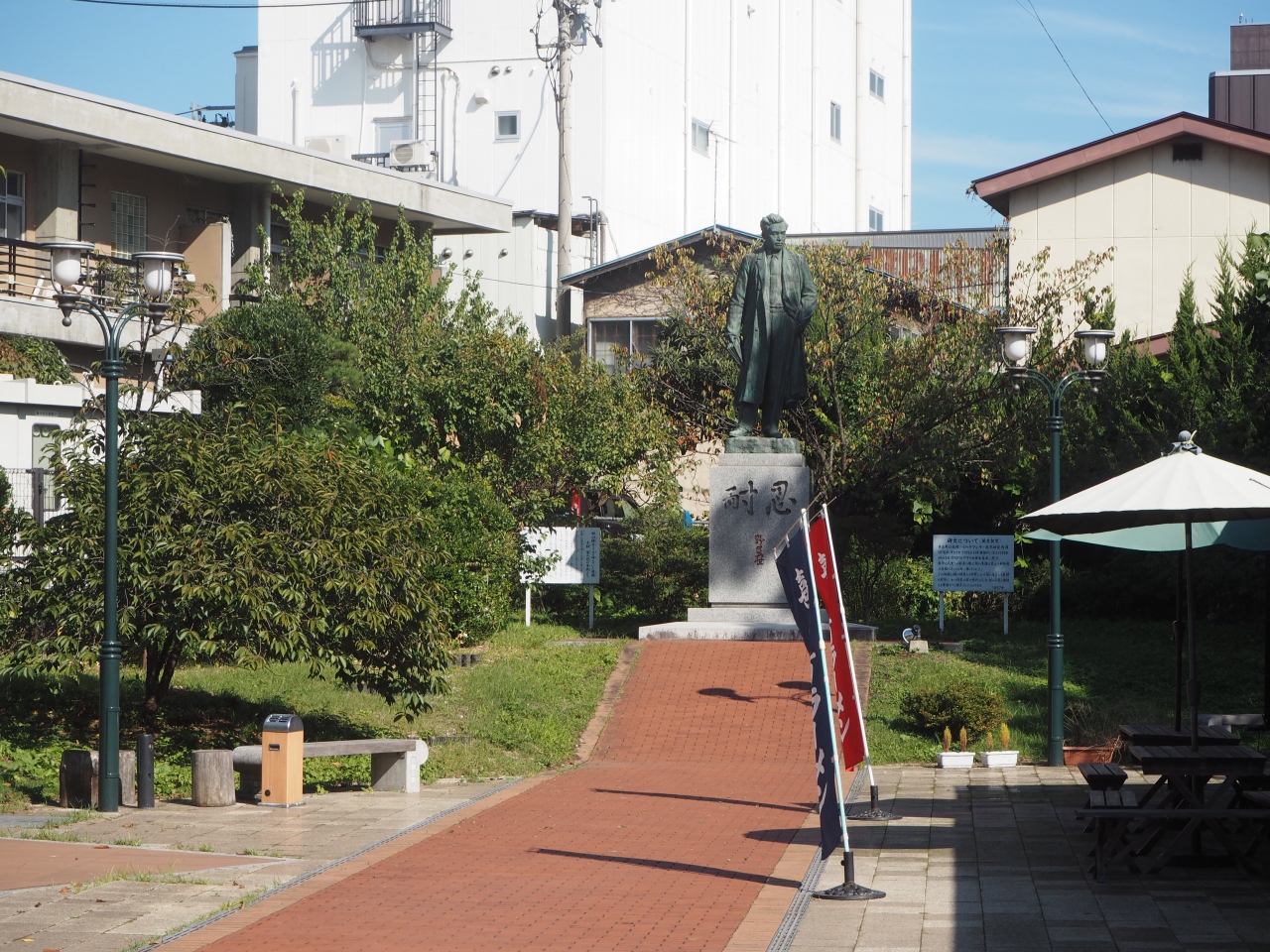 野口英世が青春時代に過ごした建物などが残っている通りが野口英世青春通りと名前が付けられていて、その通りのなかほどに野口英世青春広場があります。ラーメン店などの店が数件と中央部に広場になっていて、奥に野口英世の像があります。野口英世の像は壮年時代のようでした。野口英世が過ごした会津時代の若い時の像でもよかったのではと思います。