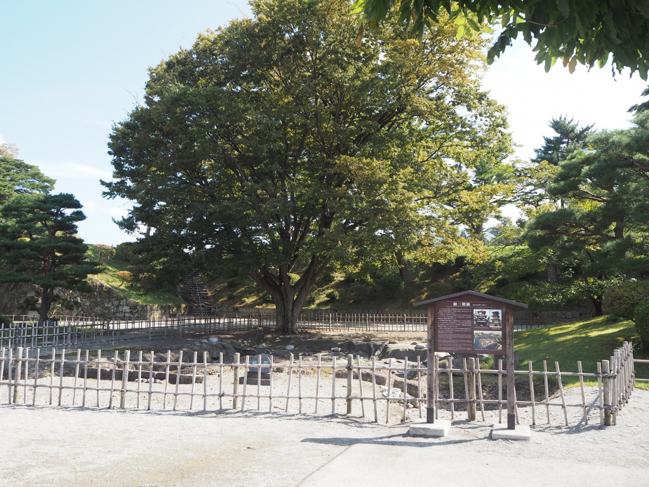 鶴ケ丘城の本丸の敷地内に御三階跡があります。本丸にはかつては天守閣以外にも殿様や家族などが住む平屋の邸宅が造られていましたが、こちらには三階建ての家が建てられていました。外観は三階ですが、なかは四階建てという構造になっていました。1階分は狭い階であったので、密議の場所であったともいわれています。明治初期に天守閣が取り壊しの時に、七日町駅近くの阿弥陀寺に移築されています。