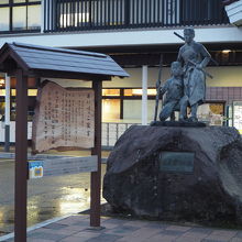 会津若松駅前の広場の駅を出てすぐの場所に白虎隊士の像があります。立ち姿と跪いた姿の2人のりりしい姿の像です。大きさは等身大くらいです。夜はライトアップもなく、まわりも暗くなるので、わかりにくくなります。せっかくならもっと大きな像でもよかったのではと思います。