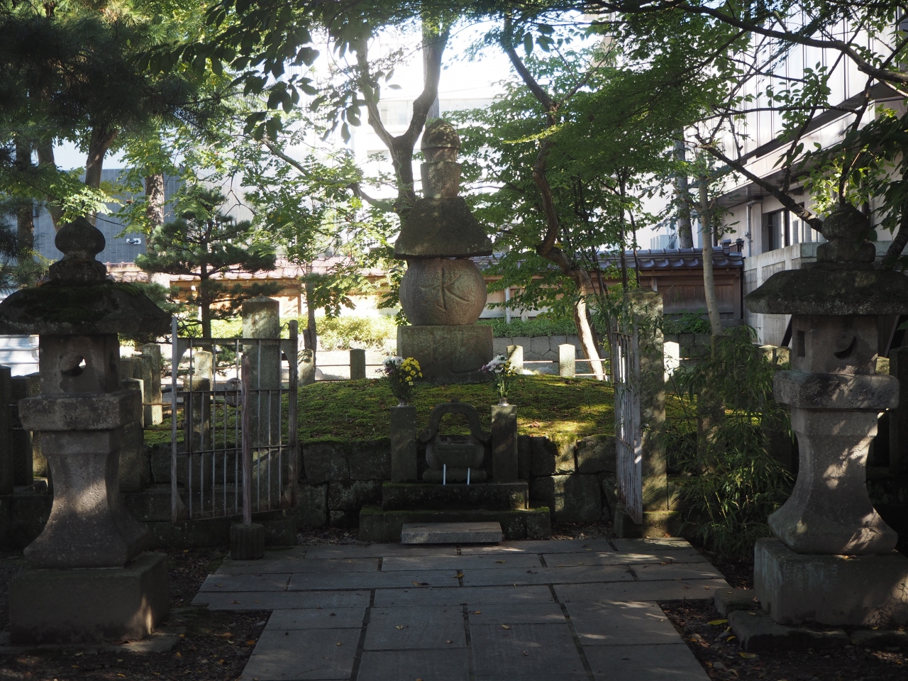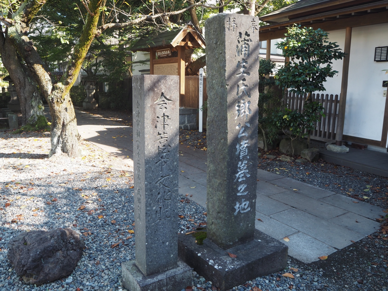 神明通りのアーケードから東側の小道を入ってすぐの場所にある興徳寺の境内に蒲生氏郷の墓があります。蒲生氏郷は織田信長の家臣で、七層の天守閣の会津城を築いたり、会津の城下町の発展を築いた人です。お墓は五輪塔で石には「空・風・火・水・地」の言葉が記されています。横には説明板もあります。訪れる人もなく、静かな境内でした。