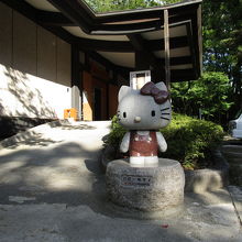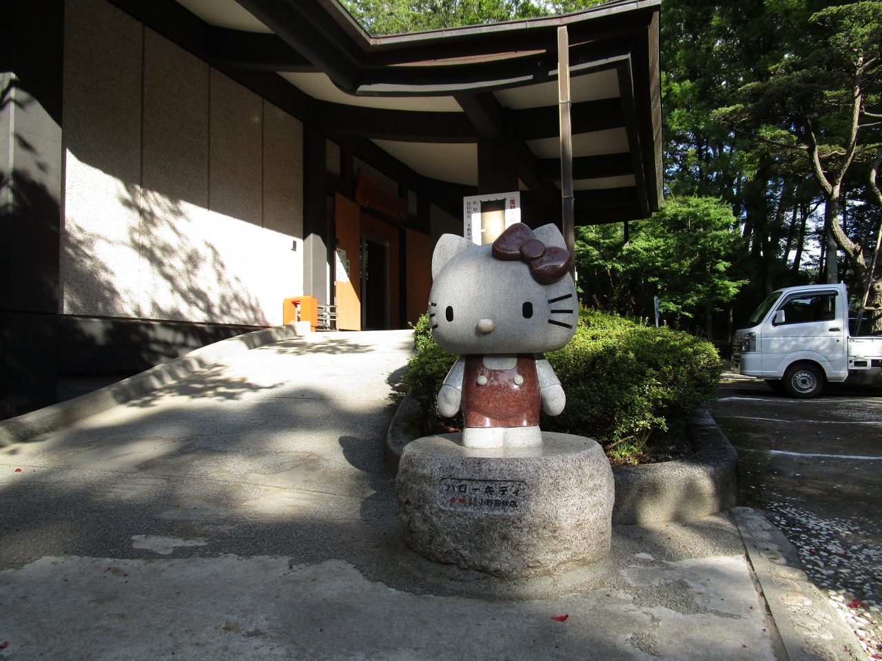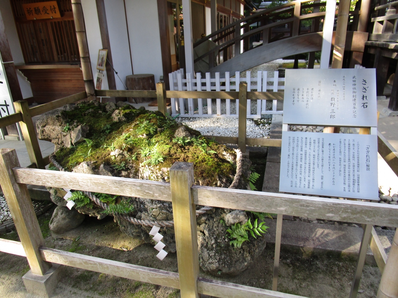 神社内右方向にあるキティちゃんの石像の後ろにある宝物殿には「吉岡一文字」(国定重要文化財)の太刀や、武田家伝来の古文書、刀剣、甲冑類などゆかりの品が多く展示されており、神社の左手にはさざれ石が飾ってありました。