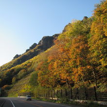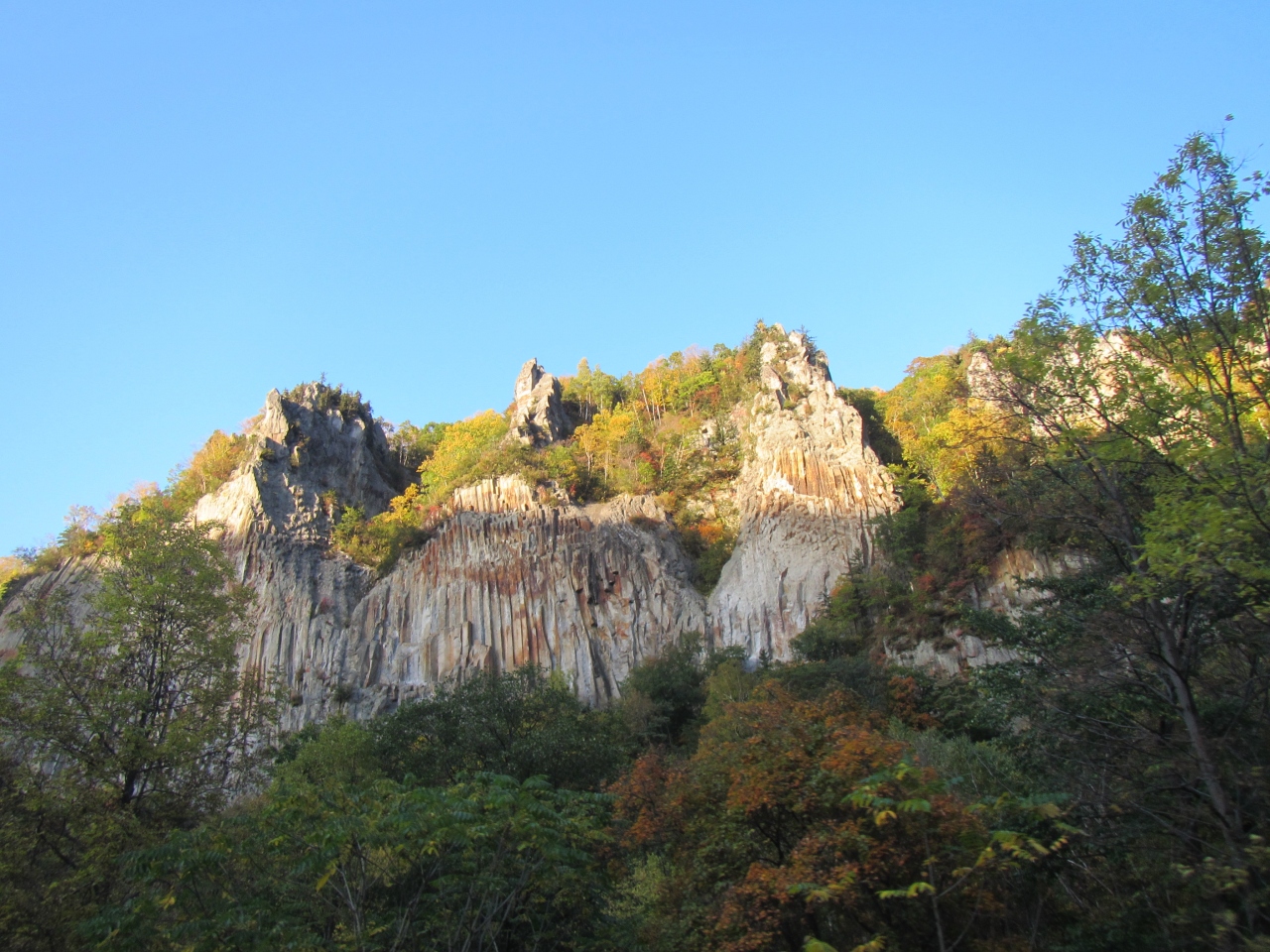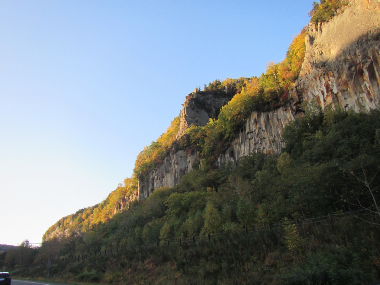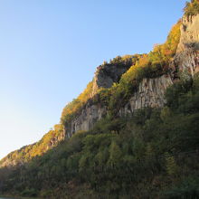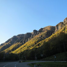 国道から見上げると、見事な柱状節理の壁が上方にそそり立っています。