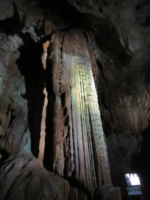 岩壁を流れる水が成長したフローストーンと呼ばれる鍾乳石です。威風堂々としたその姿は、文句なしに秋芳洞のランドマークです。表面に筋が多いなと思ったら、これはかつては滝のように水が流れていた跡だそうです。それがこのように固まってすごいことですね。