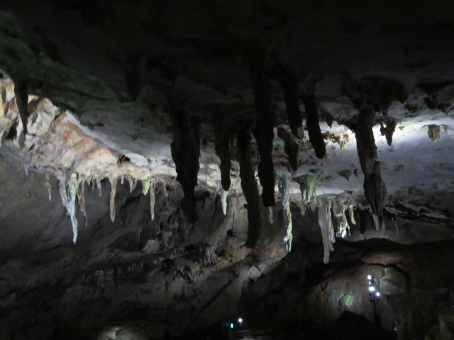 秋芳洞の中ほどにあります。天井に傘をぶらさげていた昔の傘屋のように、つらら石が伸びる景観から「傘づくし」と名付けられたそうです。何となく不気味で、「ゲゲゲの鬼太郎」の傘お化けを思い出してしまうような景観ですね。