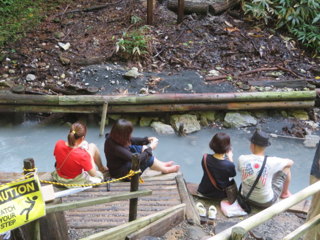 珍しい足湯です、登別温泉街の奥、大湯沼と温泉通りの間にある大湯沼川探勝歩道沿いの沢が温泉になっていて足を浸けることが出来ます、源泉は大湯沼で熱いですが流れてくるうちに丁度いい温度になっています、沢沿いにベンチがありそこに座って足湯を楽しみます、外国人も多くいます、歩き易い履物で行き、タオルを持参することが必要です、森林浴を楽しみながらの足湯です。
