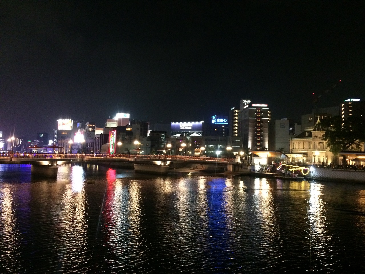 なかがわとひらがなで書かれていました。初めて見て、夜景の美しさに驚きました。那珂川ではクルージングもしていました。ストリートパフォーマンスも多くて、三味線やアンデスの音楽やギターの演奏もしていて、美しい景色に音楽で楽しい散策でした。