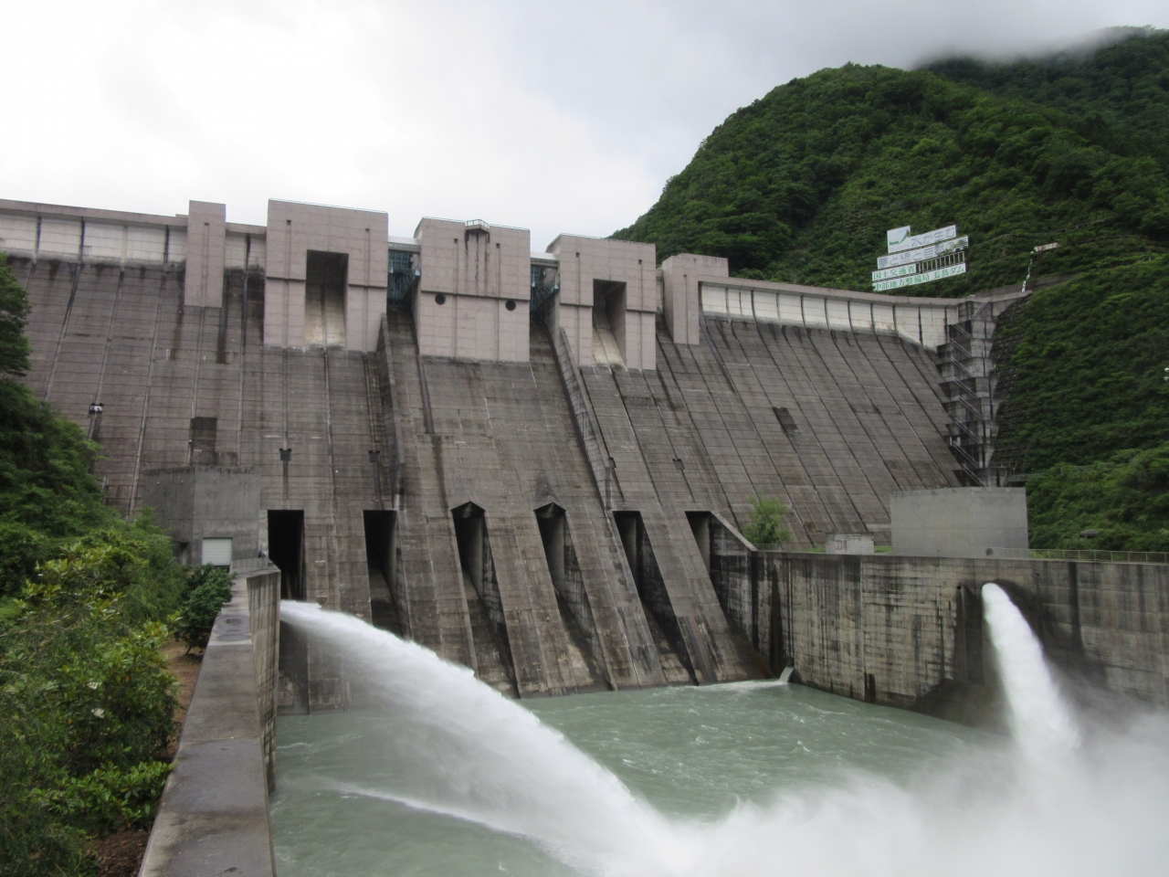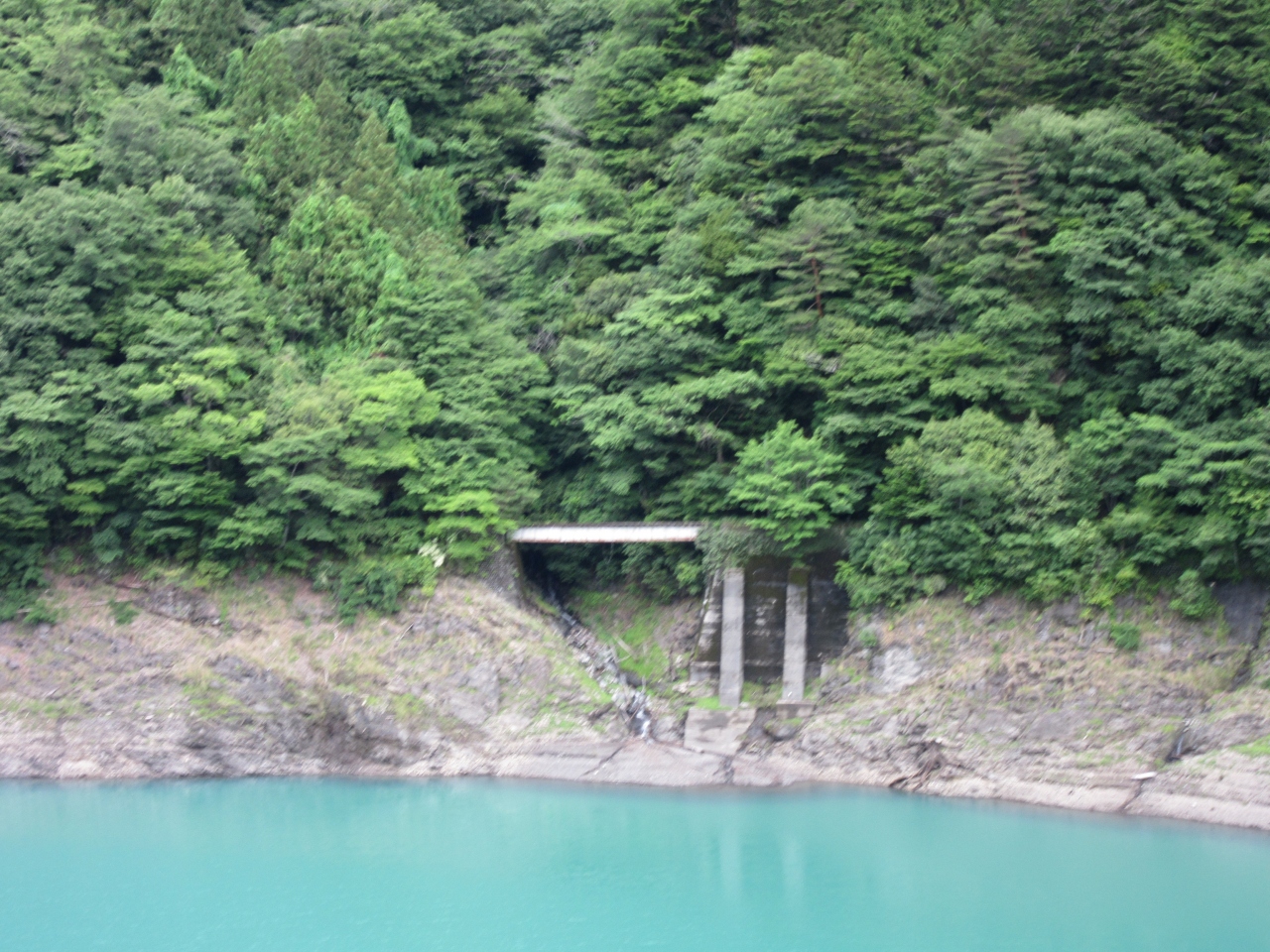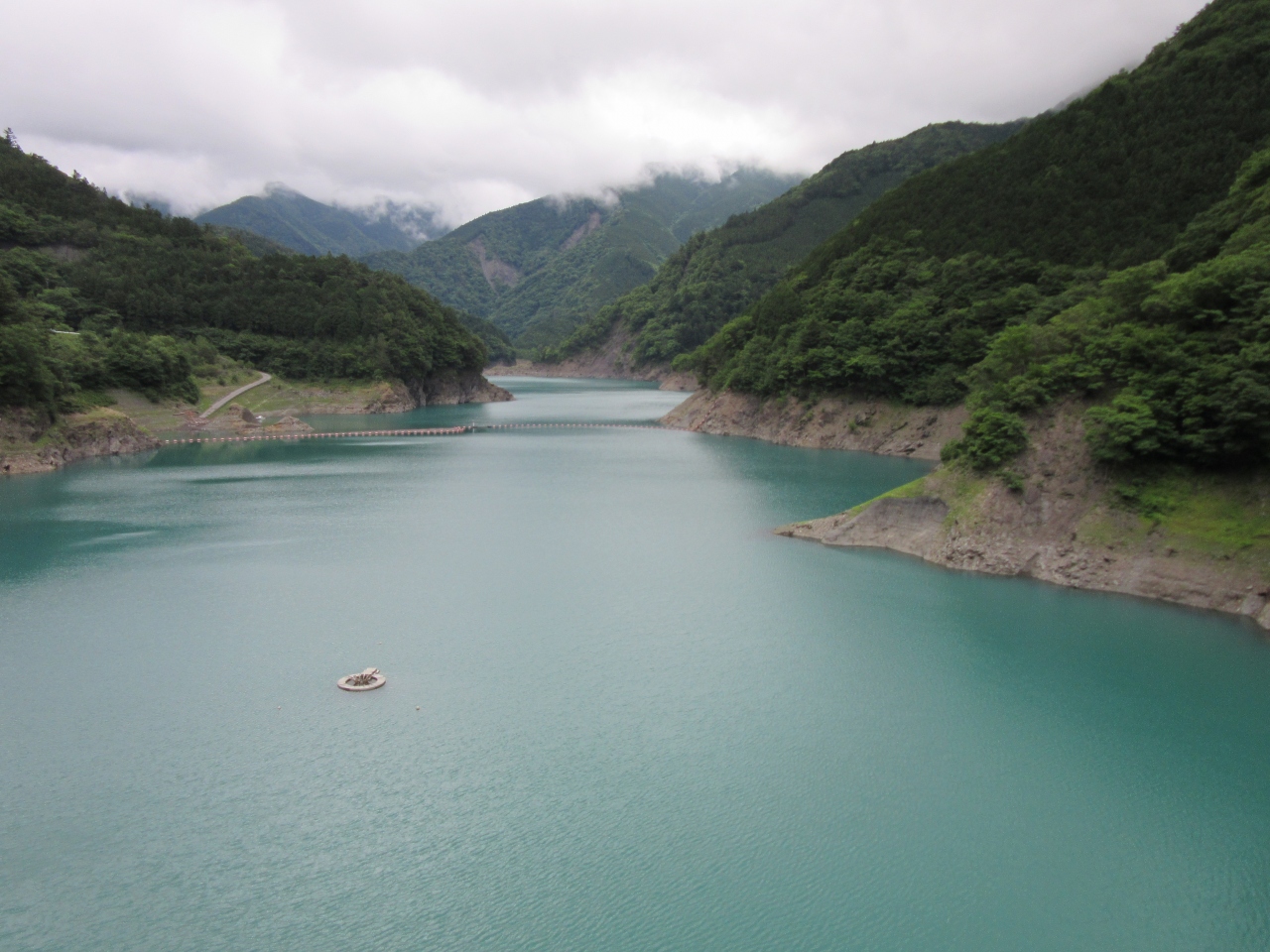 長島ダムの天端は開放されており、ダム湖側にも展望台があり、美しいエメラルドグリーンの湖面を望むことが出来ます。