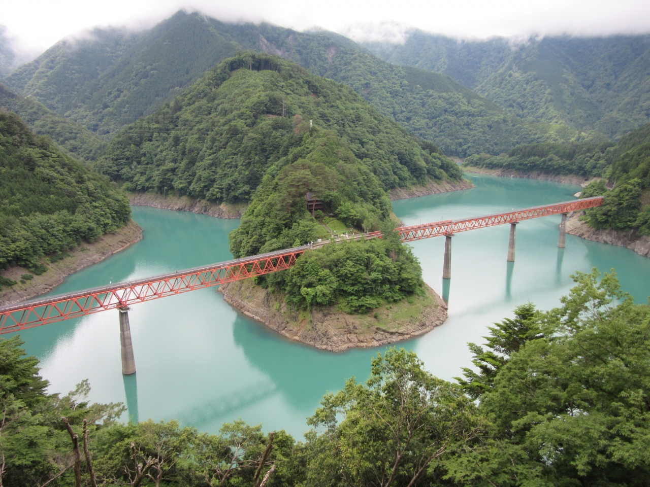 ダムからの接岨湖も美しいですが、接岨湖と言えば何と言っても大井川鉄道井川線の奥大井湖上駅付近の景色が秀逸です。橋梁の赤い鉄骨がエメラルドグリーンの湖水にとても映えます。