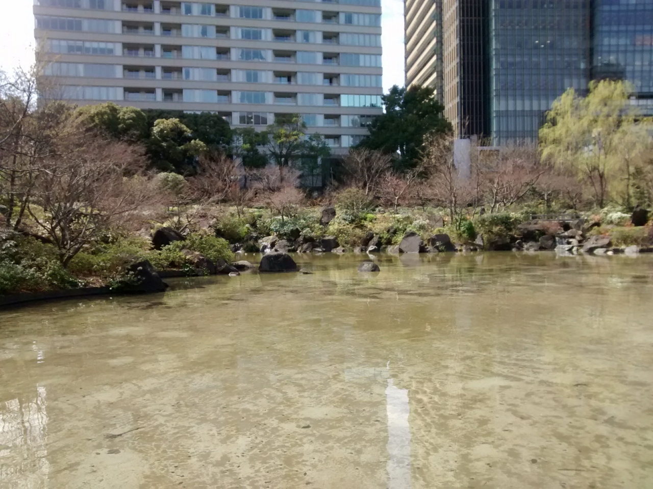 檜町公園は東京ミッドタウンに隣接した公園で、一番の見どころは、添付写真にあるような大きな日本庭園風の池です。ソメイヨシノが開花し始めた時でポカポカしていて最高でした。周囲のモダンな高層ビルとよく調和しています。