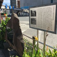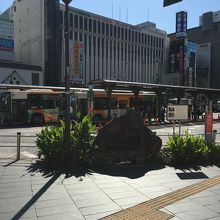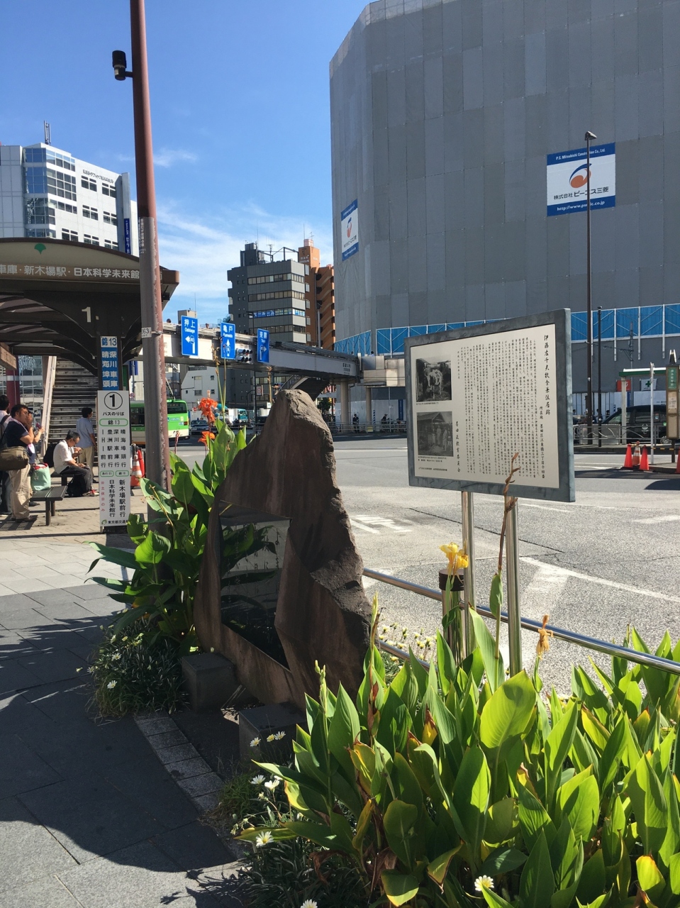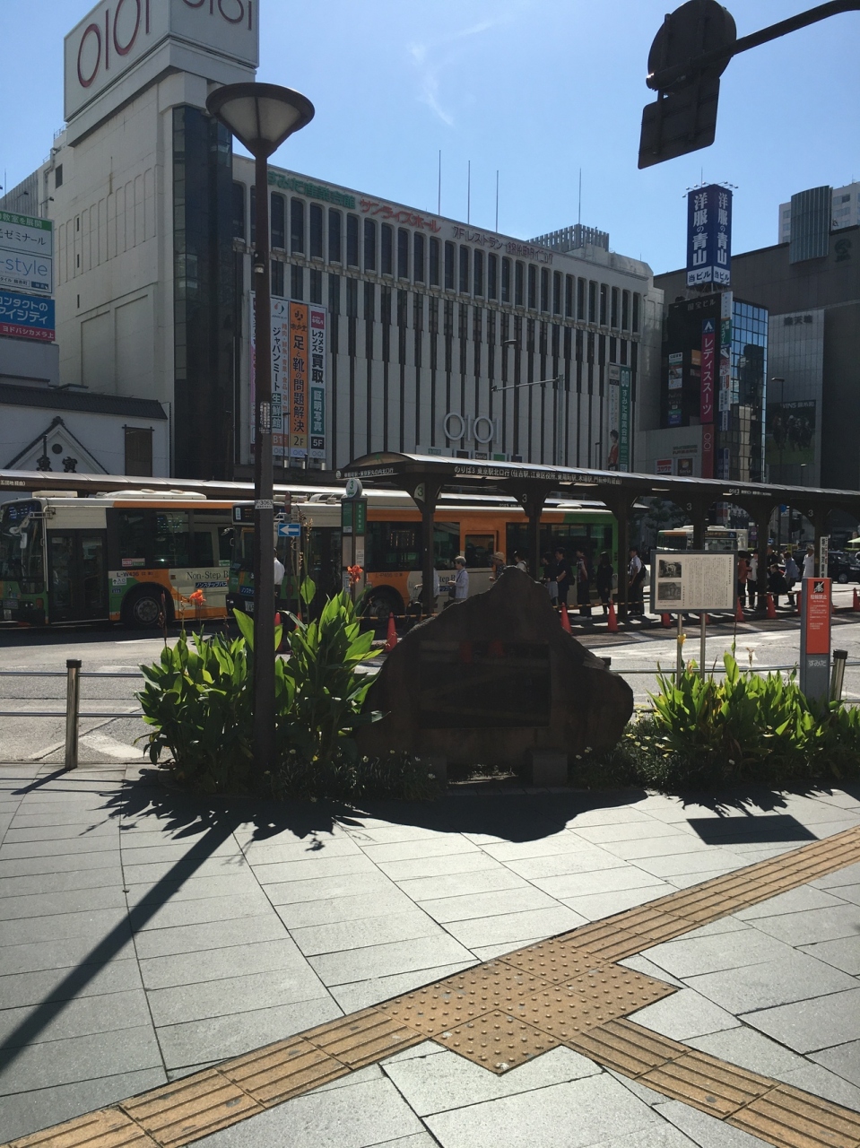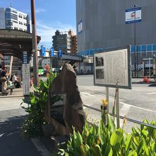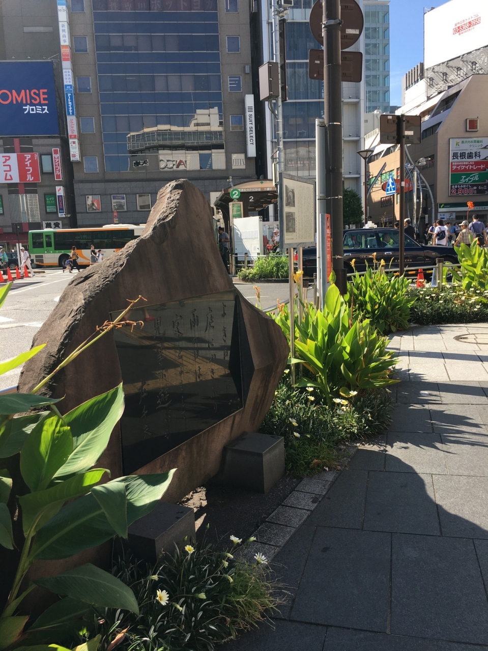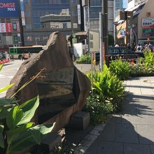 錦糸町駅前のロータリー前にありました。石碑があるので、なんなのかと立ち寄る人も多かったです。石器時代の尖った石を大きくしたような石に句が書かれていました。石碑の左右には大きな草のようなものがあり、電燈も建っていました。
