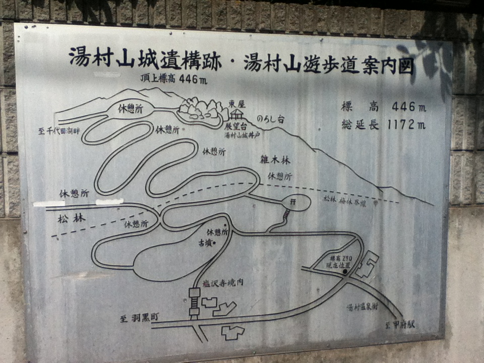 湯村山は甲府駅北西にある。湯村温泉郷から竹中英太郎記念館を経て湯村山遊歩道を登って行った。お勧めの点は、湯村山は標高446mとそれほど高くなく遊歩道が整備されていること、山頂までのルートは湯村温泉郷からのコース、湯村の塩沢寺からのコース、緑が丘運動公園からのコースがあること、コースの途中には大和政権時代以前の古墳があること、山頂には武田家時代の山城跡があること、山頂から湯村や甲府市内が見れることである。訪問時の感想は、まだ暑かったが、遊歩道の安全図や案内板が整備されていて回りの草木を見ながら無事に登れ素敵な景色を見ることができ訪問して良かった。