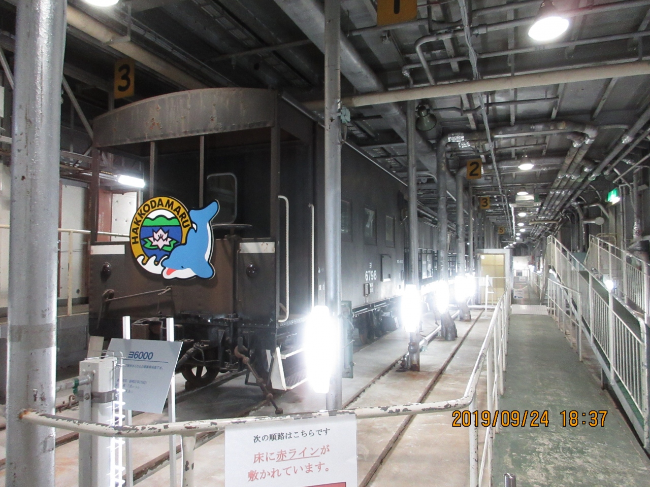 訪問した9月は19時までということなので18時30分に着いたら、入場は18時までということで入口は閉じてあった。がっかりしたが、幸い係の人が親切で、入れていただいただけでなく、見どころを案内してくれた。車両が48両積めたとのことで、外観以上に内部が大きく感じたことに驚いた。初めて知ったのは、青函連絡船は貨物車はそのまま積んだが、客車は積まなかったということです。乗客は下車して歩いて乗船し、目的地に着いたら新しい客車に乗り換えたそうです。